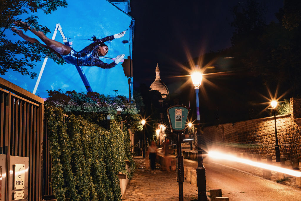 Φωτογραφία της αμερικανίδας Σιμόν Μπάιλς, χρυσής Ολυμπιονίκη ενόργανης γυμναστικής –η οποία εντυπωσίασε το κοινό με το διπλό διαγώνιο σάλτο της με τριπλή περιστροφή- ενώ γελάει ενθουσιασμένη στο βάθρο κατά τη διάρκεια της τελετής απονομής μεταλλίων μετά τον τελικό Ομαδικής Καλλιτεχνικής Γυμναστικής Γυναικών, την τέταρτη ημέρα των Ολυμπιακών Αγώνων Παρίσι 2024 στο Bercy Arena. Προβλήθηκε στις 30 Ιουλίου στη Μονμάρτρη, στο πλαίσιο των Parisienne Projections