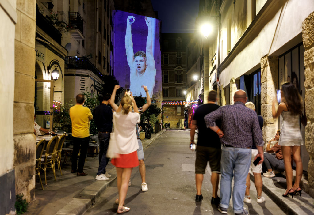 Η φωτογραφία του γάλλου πολυ-ολυμπιονίκη Λεόν Μαρσάν ενώ αγωνίζεται στα 200 μ. πεταλούδα στο La Defense Arena την τέταρτη ημέρα των Ολυμπιακών Αγώνων προβλήθηκε στο πλαίσιο των Parisienne Projections στις 30 Ιουλίου στη Μονμάρτρη. Ο 22χρονος Μαρσάν έκανε υπερήφανους τους Γάλλους, καθώς είναι ο μοναδικός αθλητής της στην Ιστορία που κέρδισε τέσσερα χρυσά μετάλλια (και ένα χάλκινο) σε ατομικά αγωνίσματα στην ίδια διοργάνωση Ολυμπιακών Αγώνων