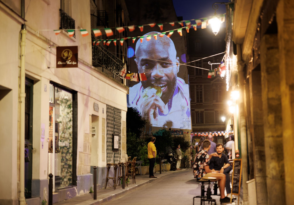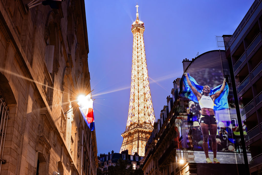 Φωτογραφία της Ζουλιέν Αλφρεντ ενώ γιορτάζει την κατάκτηση του χρυσού μεταλλίου στα 100 μέτρα γυναικών, το πρώτο μετάλλιο για τη Σάντα Λουτσία, τη μικρή χώρα - νησί της Καραϊβικής, προβλήθηκε στο Παρίσι στο πλαίσιο των Parisienne Projections στις 3 Αυγούστου
