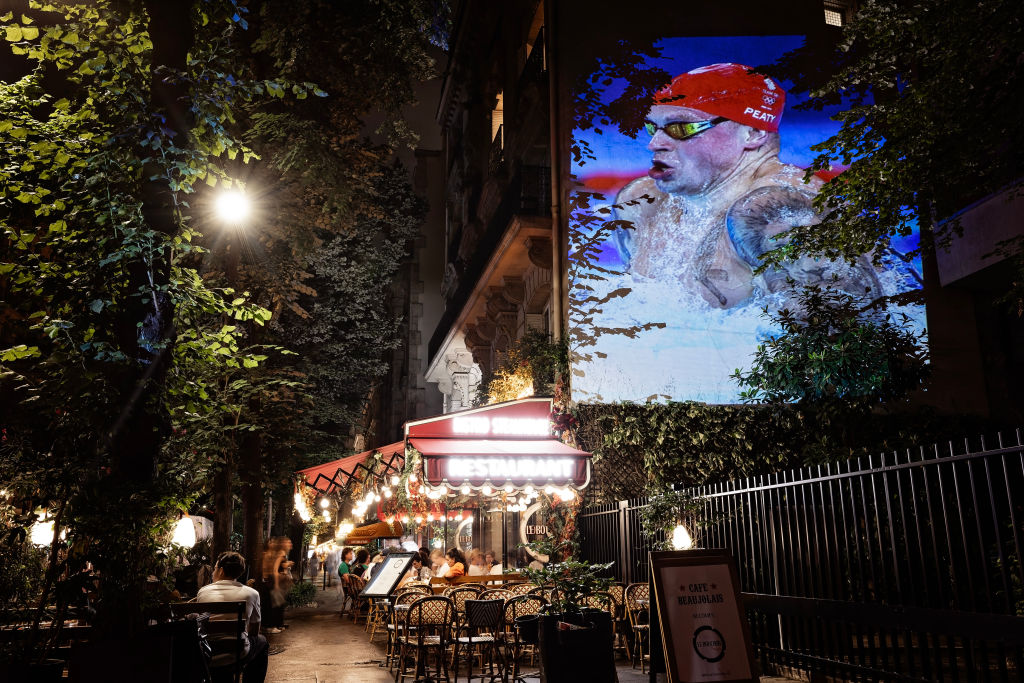 Φωτογραφία του ασημένιου Ολυμπιονίκη Ανταμ Πίτι της Ομάδας Κολύμβησης της Βρετανίας, ενώ αγωνίζεται στα 4x100 μ. μεικτή ομαδική ανδρών, προβλήθηκε στις 3 Αυγούστου στο Παρίσι στο πλαίσιο των Parisienne Projections