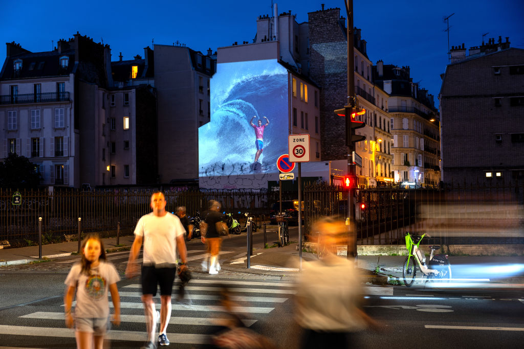 Φωτογραφία του Κάουλι Βάαστ, ο οποίος κατέκτησε το πρώτο γαλλικό χρυσό μετάλλιο στην ιστορία των Ολυμπιακών Αγώνων σέρφινγκ, ενώ βγαίνει από τα κύματα την ένατη ημέρα των Ολυμπιακών Αγώνων στο Τιχουπό της Γαλλικής Πολυνησίας. Προβλήθηκε στο Παρίσι στις 6 Αυγούστου, στο πλαίσιο των Parisienne Projections