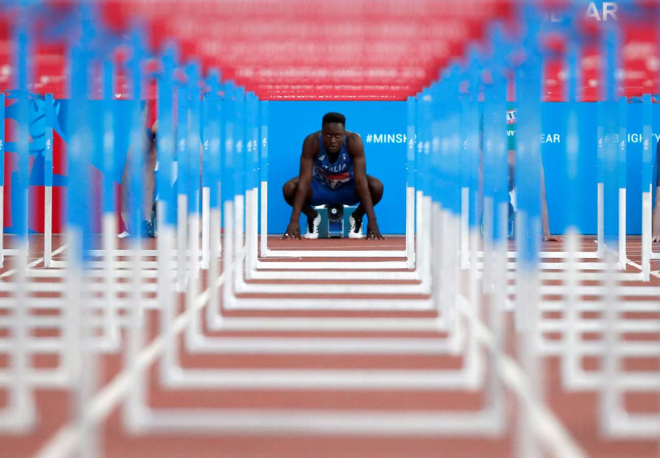 Ο Χασάνε Φοφανά κοιτά τα εμπόδια που πρέπει να υπερπηδήσει πριν τον αγώνα των 110μ., στους Ευρωπαϊκούς Αγώνες του Μινσκ της Λευκορωσίας