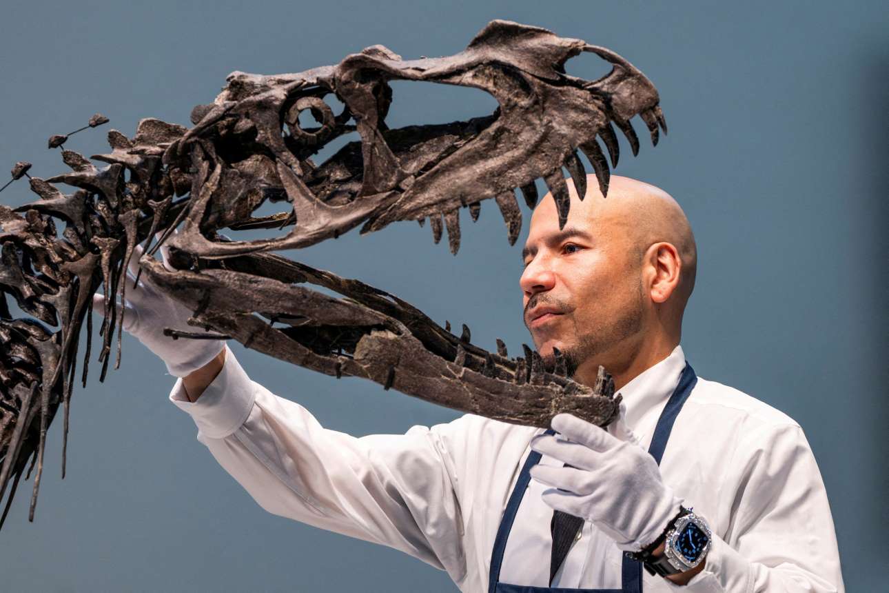 Ο ειδικός τακτοποιεί τον σκελετό νεαρού κερατόσαυρου κατά την παρουσίαση των αντικειμένων φυσικής ιστορίας που βγαίνουν στο σφυρί από τον οίκο Sotheby’s στη Νέα Υόρκη