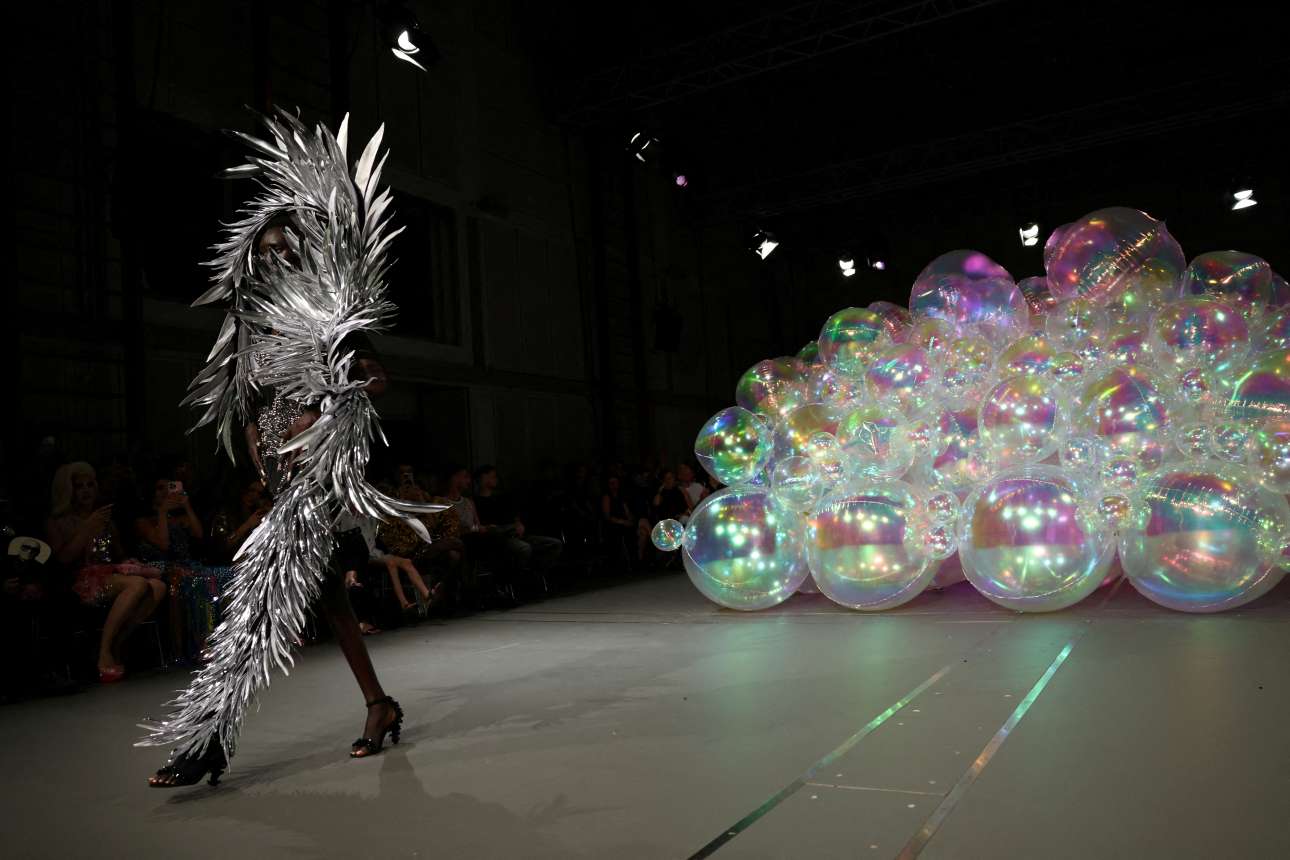 Το μοντέλο δείχνει σχετικά άνετο μέσα στο... φτερωτό του ένδυμα, μια δημιουργία του σχεδιαστή μόδας Κέβιν Τζερμάνιερ, μέρος της νέας συλλογής του για το φθινόπωρο/χειμώνα 2025-2026, που παρουσιάστηκε στο Παρίσι