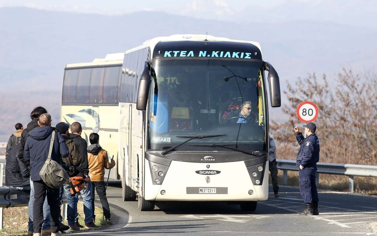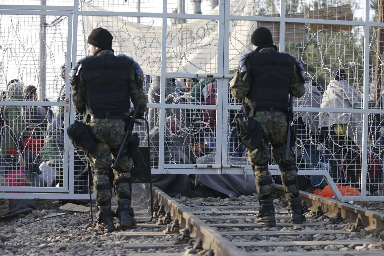 Ανδρες των Ενόπλων Δυνάμεων ελέγχουν τα χαρτιά προσφύγων προκειμένου να τους επιτρέψουν να εξέλθουν του hotspot για να συνεχίσουν το ταξίδι τους προς τα σύνορα με την ΠΓΔΜ