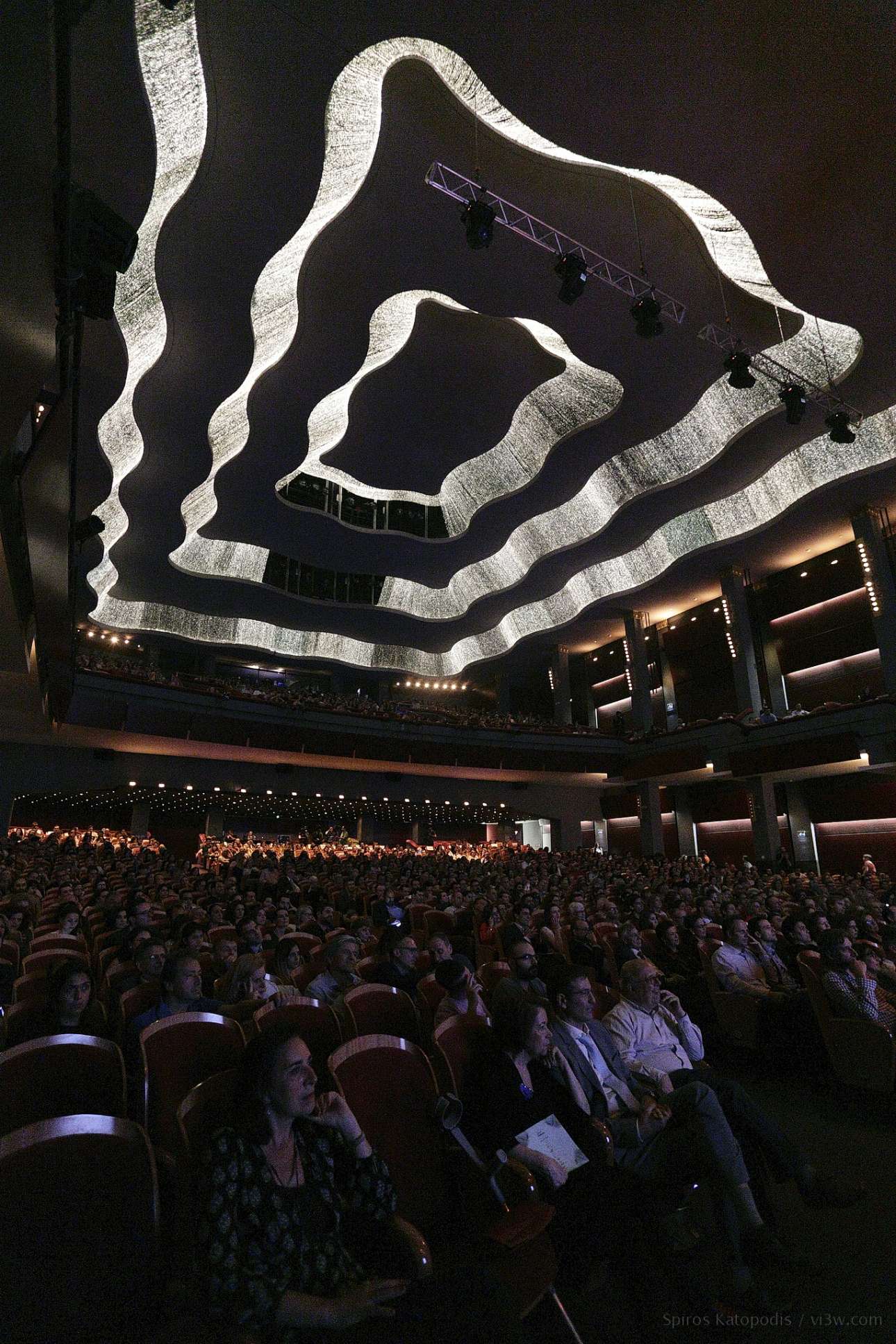 Οι δύο παρουσιαστές της βραδιάς, ο Οδυσσέας Παπασπηλιόπουλος και η Μαρίζα Ρίζου στη σκηνή του Παλλάς