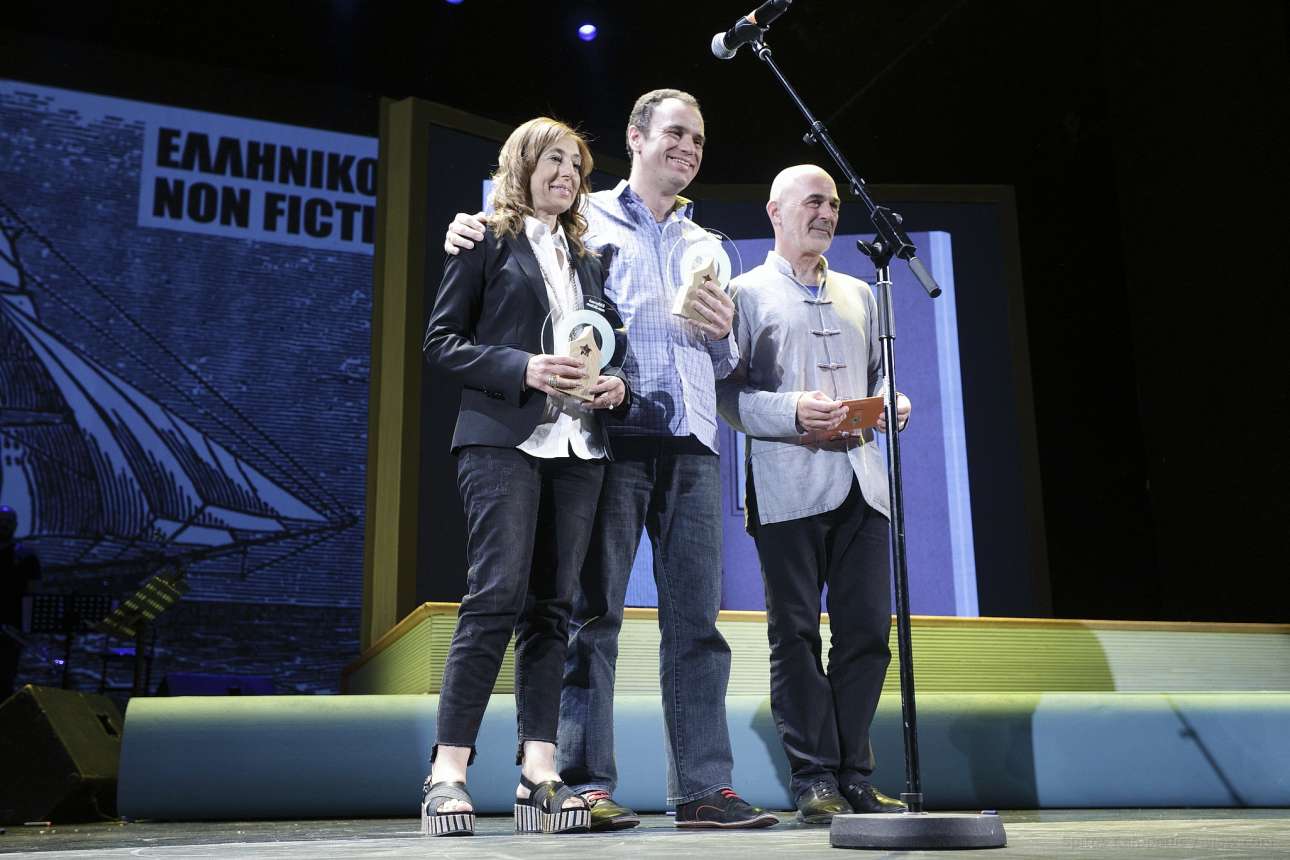Ο συγγραφέας Αντώνης Μυλωνάκης και ο εκδότης της Μικρής Άρκτου Παρασκευάς Καρασούλος παραλαμβάνουν το βραβείο από τον βετεράνο διεθνή μπασκετμπολίστα Θοδωρή Παπαλουκά