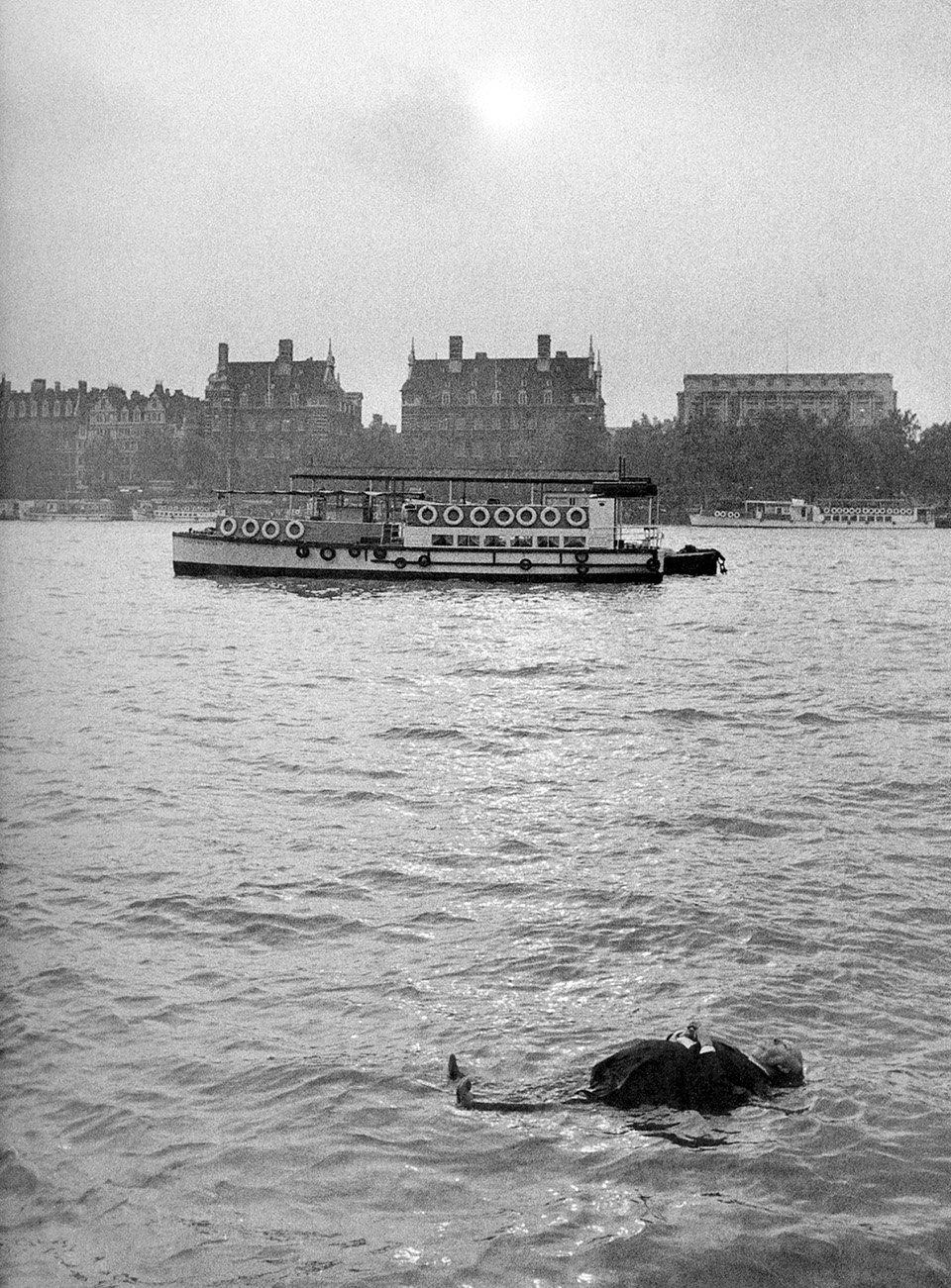 «Φρενίτις» (Frenzy), 1972. Μία κούκλα-ομοίωμα του Χίτσκοκ επιπλέει στον ποταμό Τάμεση, μέρος ενός αστείου διαφημιστικού τρέιλερ για την ταινία «Φρενίτις». O βρετανός σκηνοθέτης λάτρευε το μαύρο χιούμορ, το οποίο έγινε και σήμα κατατεθέν του