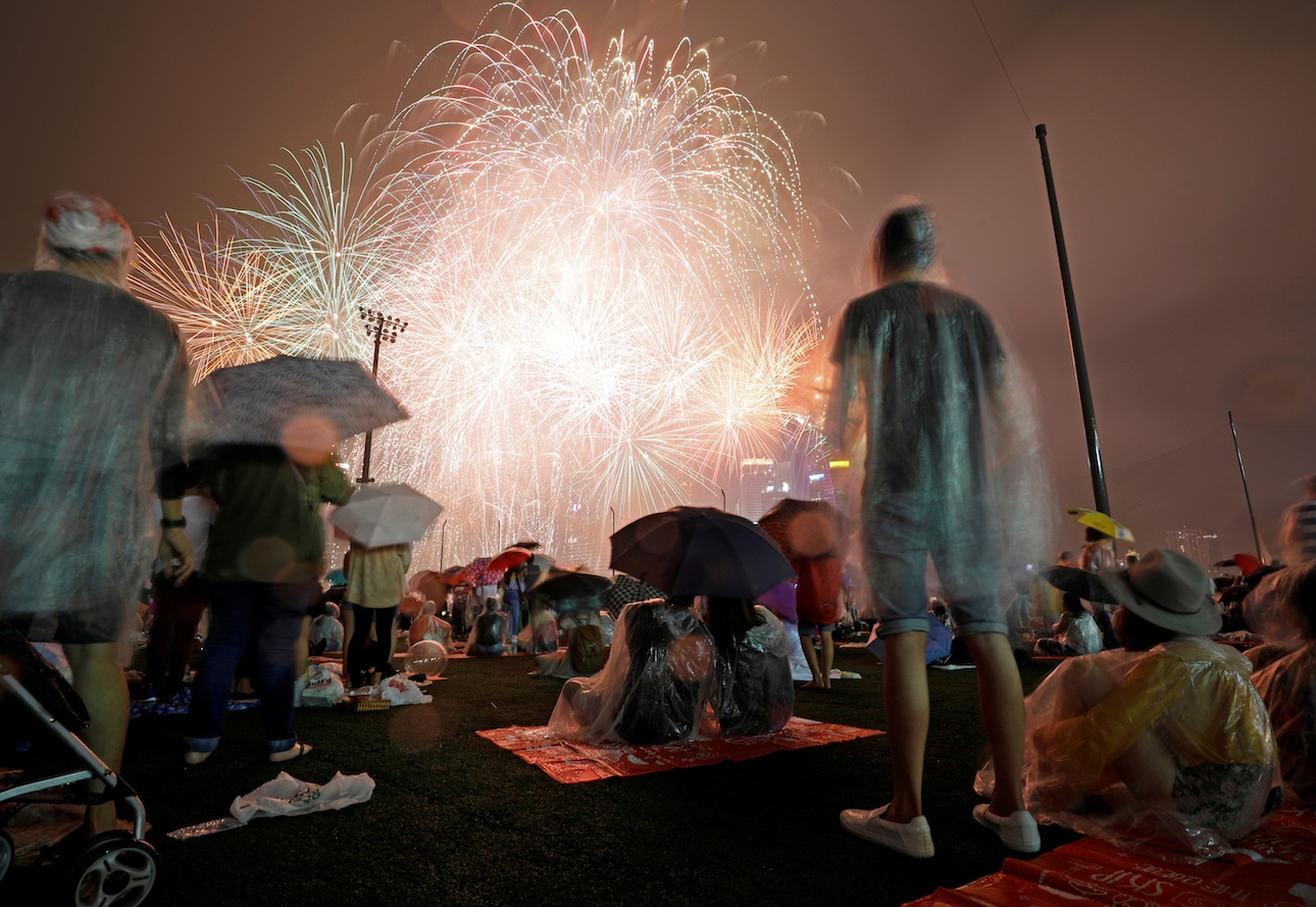 Υπό καταρρακτώδη βροχή, αμέτρητοι πολίτες στη Σιγκαπούρη έσπευσαν στο λιμάνι για να θαυμάσουν τα πυροτεχνήματα