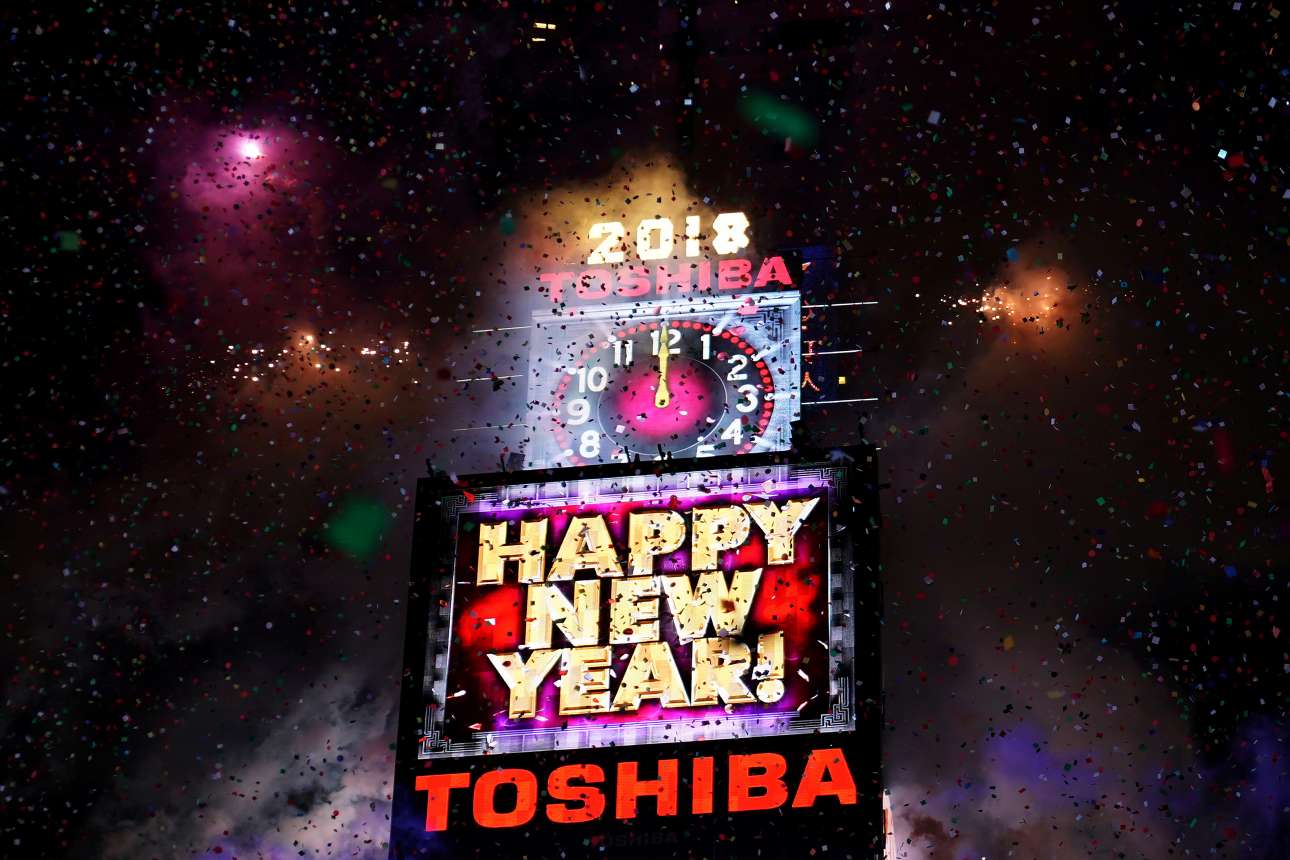 Την ίδια ώρα στο Μανχάταν, της Νέας Υόρκης, το ρολόι στην Τάιμς Σκουέαρ δείχνει 12 τα μεσάνυχτα. «Happy New Year», κομφετί, πυροτεχνήματα και φυσικά χορηγοί...