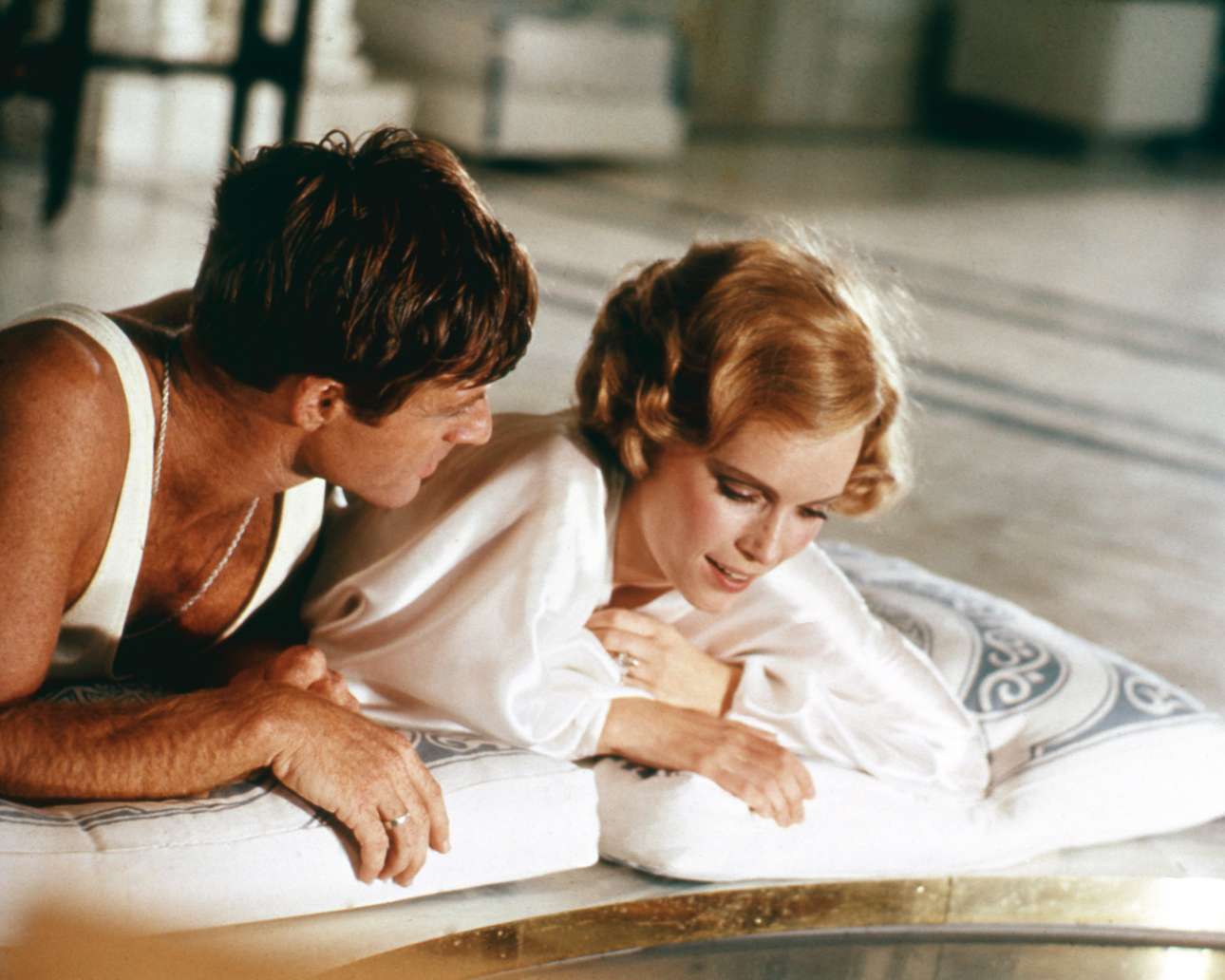 Πάνω σε λευκά μαξιλάρια με τη Μία Φάροου, στα γυρίσματα της ταινίας «Ο μεγάλος Γκάτσμπι» (1974)