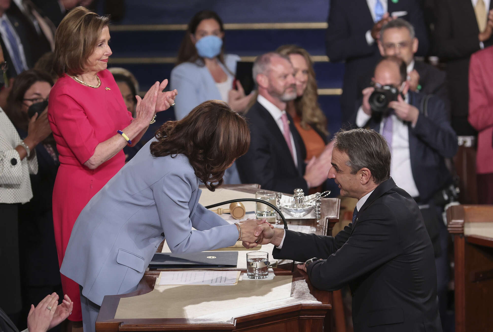 Την ιστορική ομιλία Μητσοτάκη στο Κογκρέσο χειροκρότησαν η αντιπρόεδρος των ΗΠΑ, Κάμαλα Χάρις, και η Πρόεδρος της Βουλής των Αντιπροσώπων, Νάνσι Πελόζι. Οι δύο γυναίκες κατέχουν τα δύο υψηλότερα αξιώματα του αμερικανικού πολιτικού συστήματος μετά από εκείνο του Προέδρου