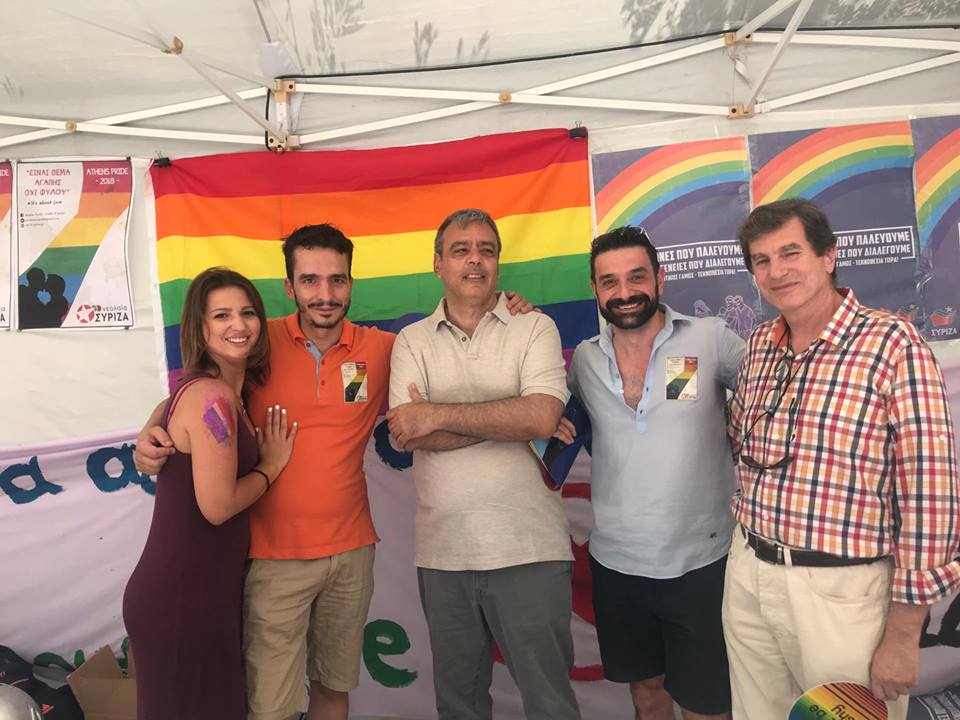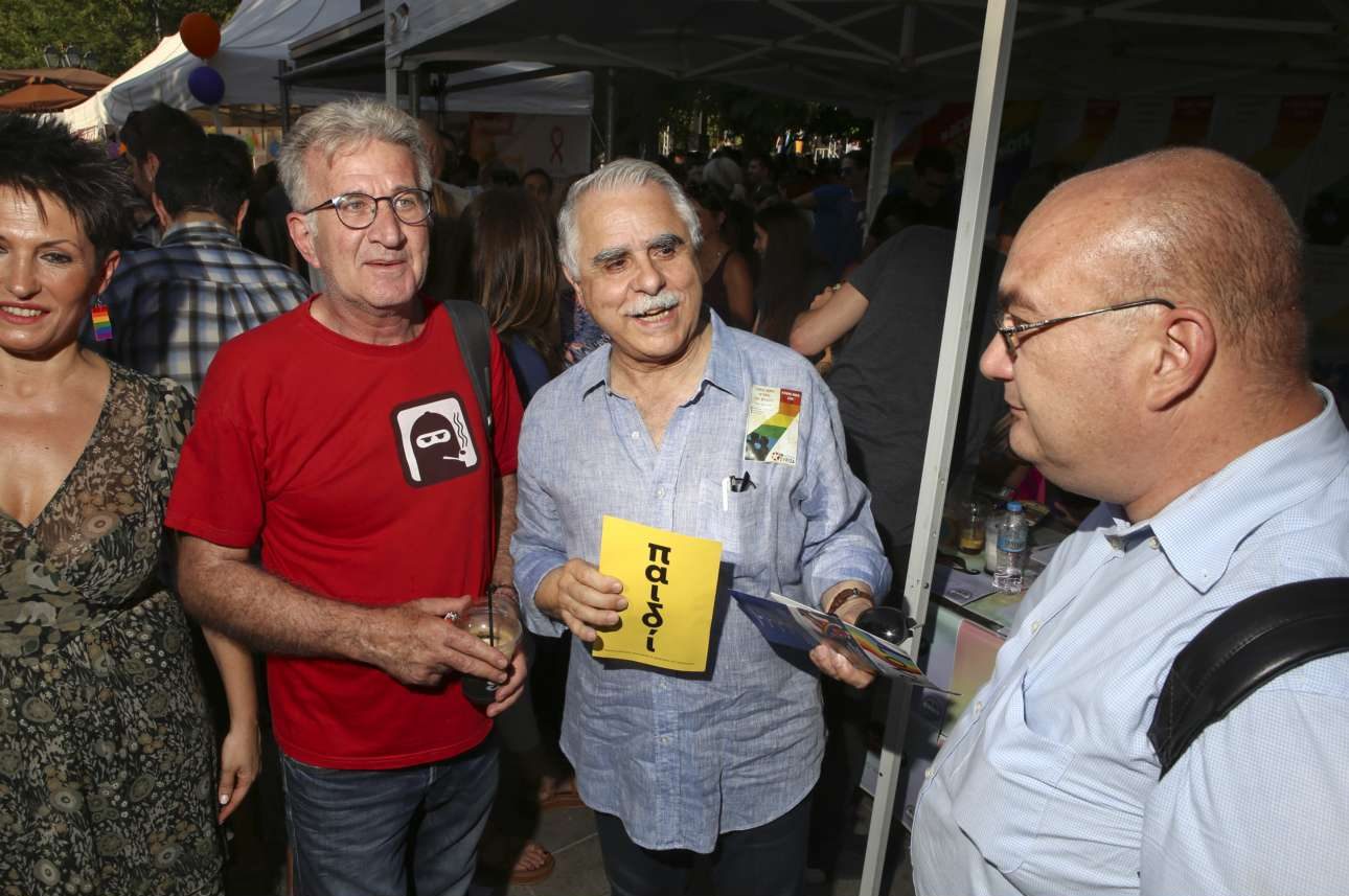 Ο υπουργός Επικρατείας Χριστόφος Βερναρδάκης (στον μέσον) στο περίπτερο της Νεολαίας ΣΥΡΙΖΑ στο Pride
