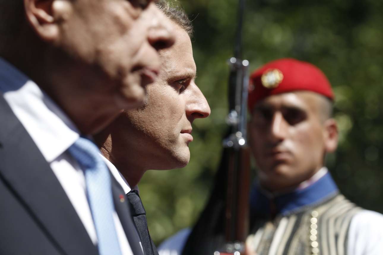 Προκόπης Παυλόπουλος και Εμανουέλ Μακρόν βαδίζουν στο κόκκινο χαλί στον δρόμο προς το Προεδρικό Μέγαρο