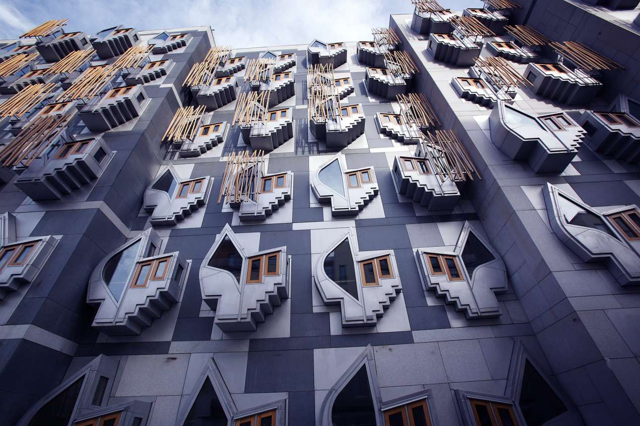 Βουλή της Σκωτίας. Το νέο κτιριακό συγκρότημα της επίσημης έδρας του Σκωτικού Κοινοβουλίου εγκαινιάστηκε το 2004 στην περιοχή Χόλιρουντ του Εδιμβούργου. Σχεδιάστηκε από τον καταλανό αρχιτέκτονα Ενρικ Μιράγιες και χαρακτηρίζεται από φυλλόσχημα κτίρια, μια πτέρυγα με γρασίδι στη στέγη που καταλήγει σε ένα πάρκο και τοίχους που χτίστηκαν με τις πέτρες προηγούμενων κτιρίων