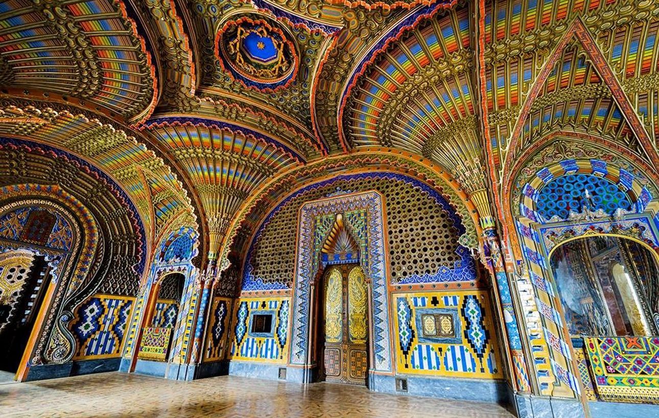 Κάστρο του Σαμετζάνο, Λέτσο, Ιταλία. Παγώνια και άλλα εξωτικά στοιχεία ήταν η πηγή έμπνευσης για την εκπληκτική διακόσμηση της οροφής του παλάτσο που χτίστηκε από έναν ισπανό αριστοκράτη στις αρχές του 1600 κοντά στην Φλωρεντία. Τον 19ο αιώνα ο απόγονός του αρχιτέκτονας Φερντινάντο Πανθιατίτσι Σιμένες το ανακαίνισε προσδίδοντάς του το χαρακτηριστικό μαυριτανικό στυλ. Μετά τον 2ο Παγκόσμιο Πόλεμο λειτούργησε ως ξενοδοχείο πολυτελείας, σήμερα όμως στέκει έρημο πια περιμένοντας να ανακαινιστεί