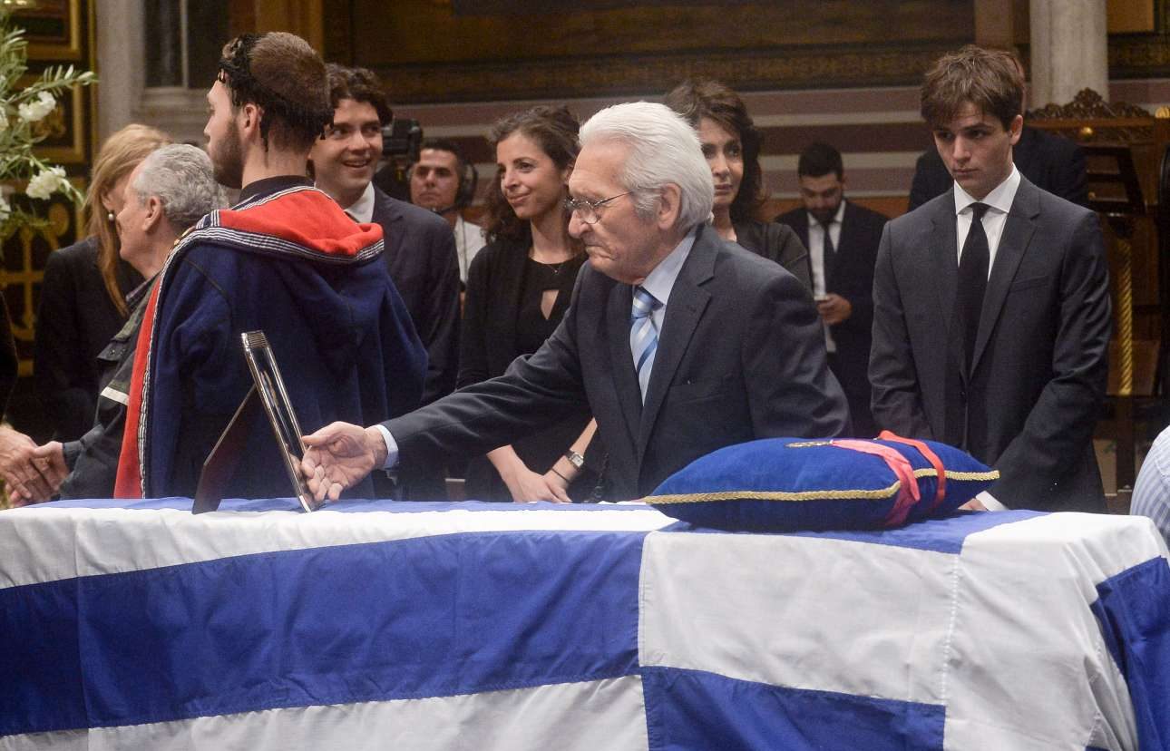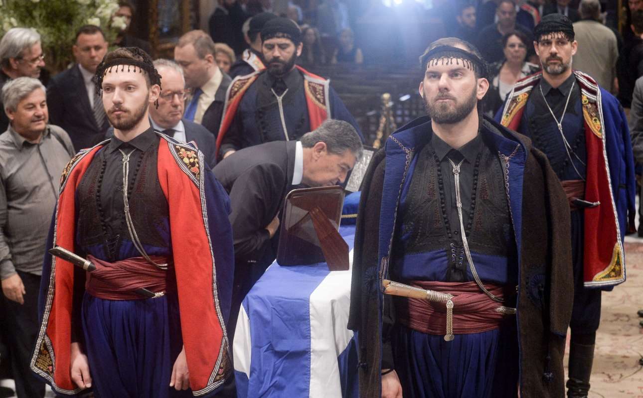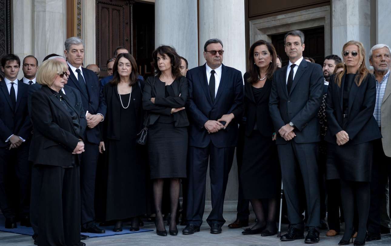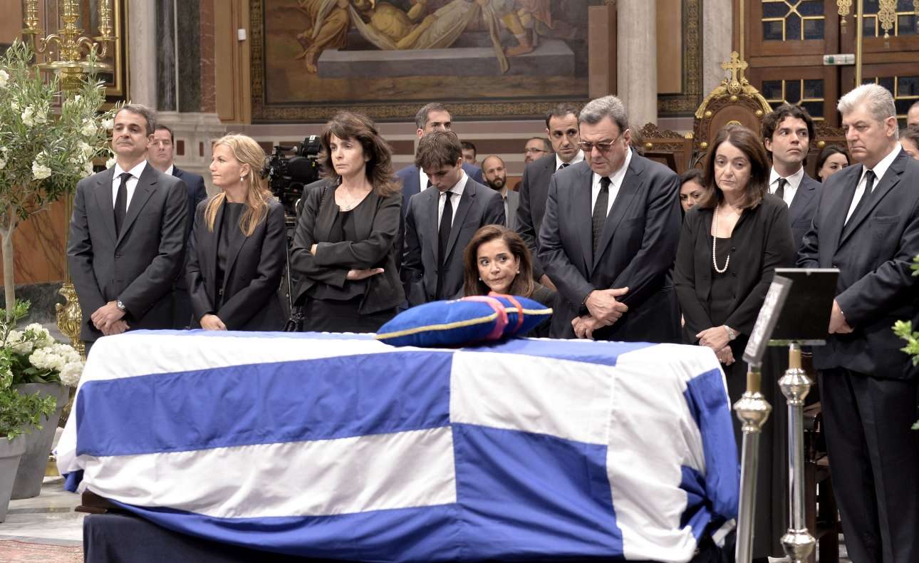 Η οικογένεια του Κωνσταντίνου Μητσοτάκη μπροστά από το φέρετρο. Τυλιγμένο με την ελληνική σημαία. Ο πρόεδρος της ΝΔ πρώτος από αριστερά