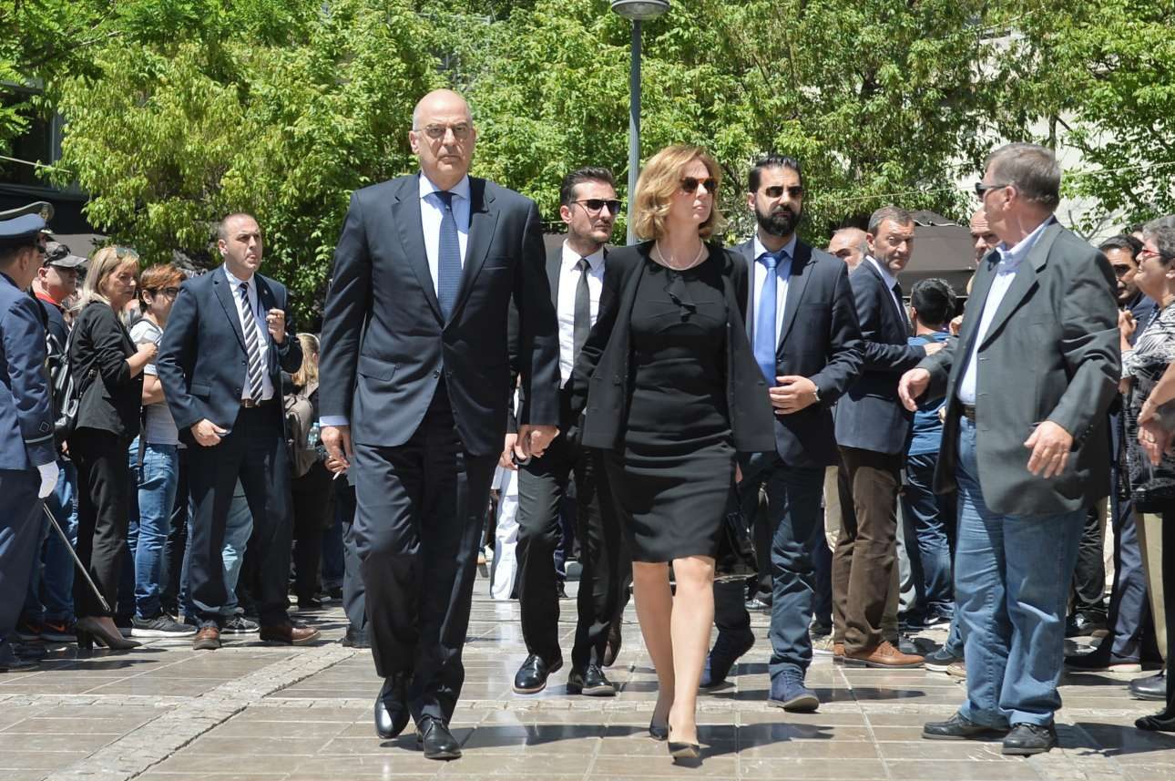 Η οικογένεια μπροστά από το φέρετρο. Η Ντόρα Μπακογιάννη κάθεται καθώς πρόσφατα υποβλήθηκε σε χειρουργική επέμβαση στο πόδι