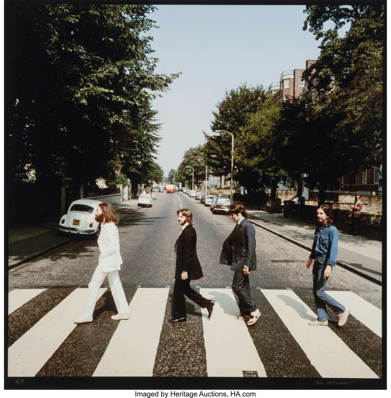 Μία παραλλαγή από το εμβληματικό εξώφυλλο του άλμπουμ «Abbey Road» των Beatles, 1969. Στο εξώφυλλο τα «Σκαθάρια» βάδιζαν από τα αριστερά προς τα δεξιά