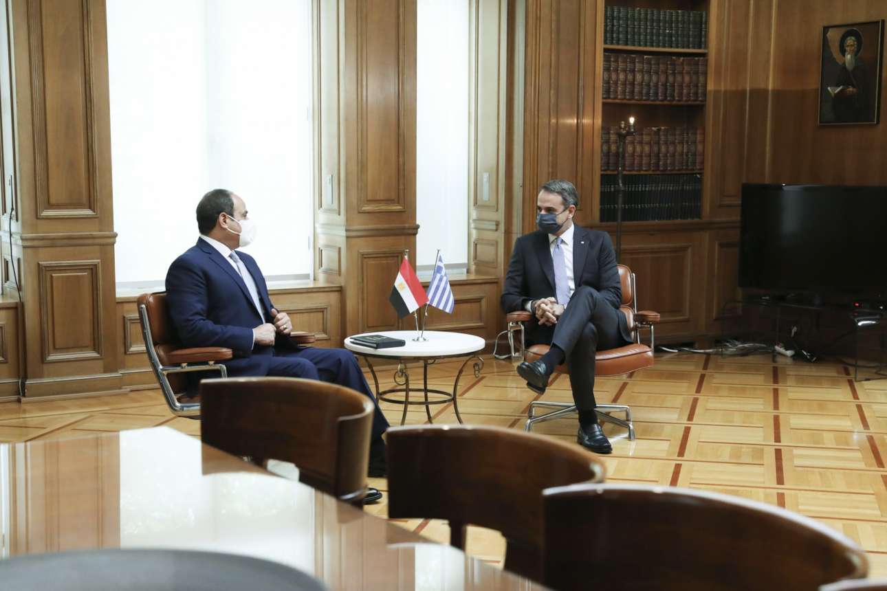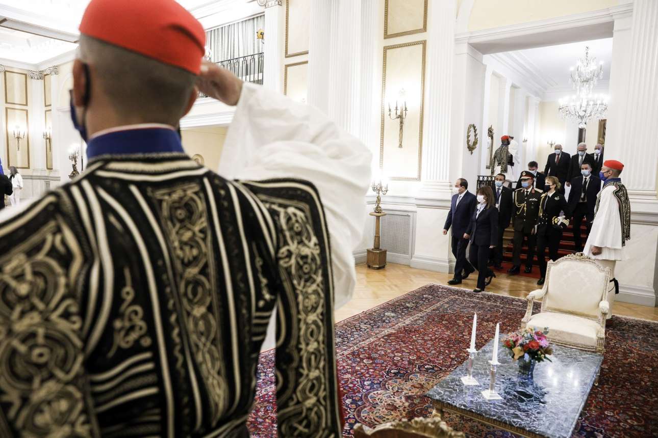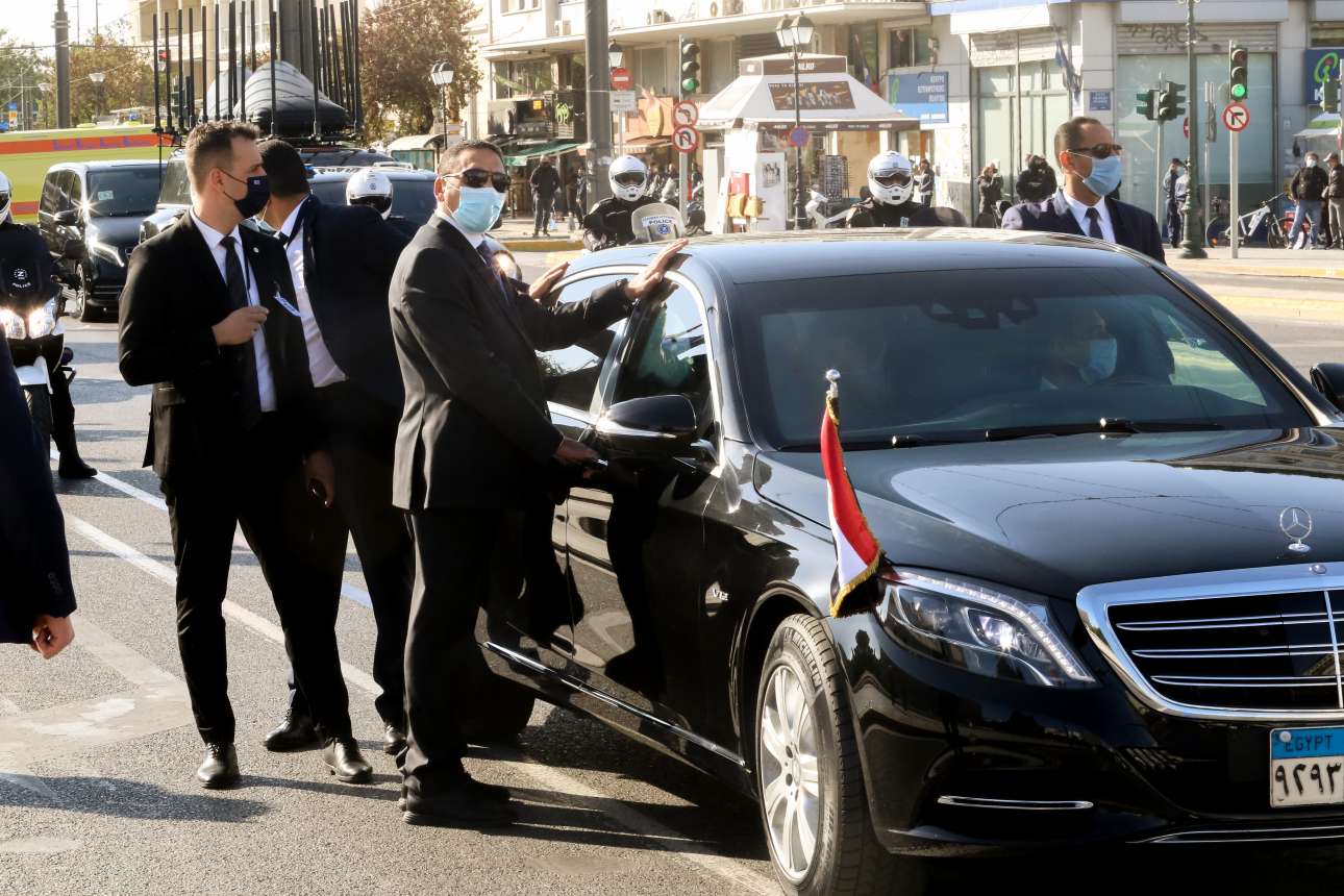 Υπό δρακόντεια μέτρα ασφαλείας, ο πρόεδρος της Αιγύπτου, που έφτασε το βράδυ της Τρίτης στο «Ελ. Βενιζέλος» και διανυκτέρευσε στην Αθήνα, ακολούθησε την εθιμοτυπία: πρώτα κατάθεση στεφάνου στο μνημείο του Αγνώστου Στρατιώτη, μετά επίσκεψη στην Πρόεδρο της Δημοκρατίας Κατερίνα Σακελλαροπούλου και έπειτα στο Μέγαρο Μαξίμου με τον Κυριάκο Μητσοτάκη –με τον οποίο η συζήτηση ξεκίνησε από το χρώμα της γραβάτας