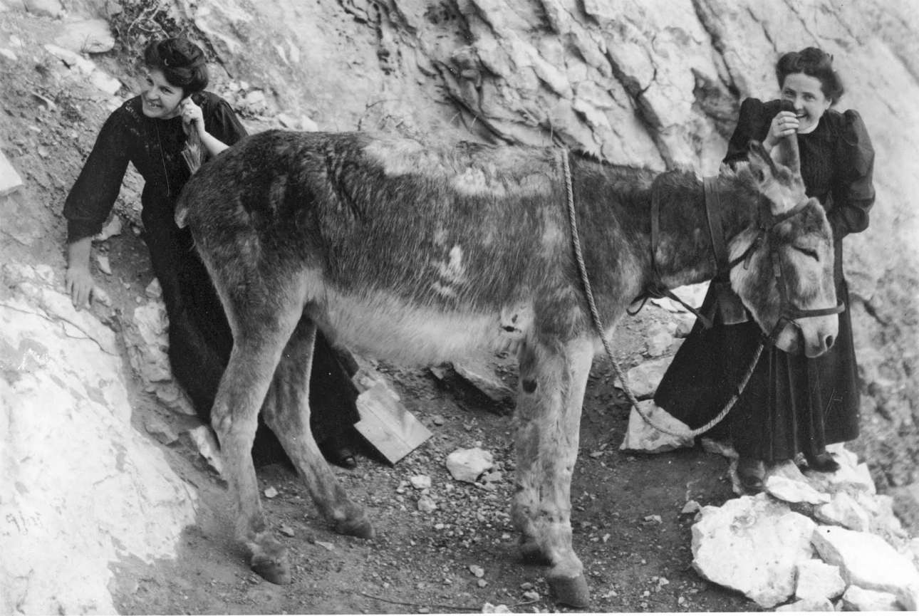 Δύο γυναίκες μετατρέπουν το γαϊδούρι σε τηλέφωνο και ξεσπούν σε γέλια, το 1906 περίπου
