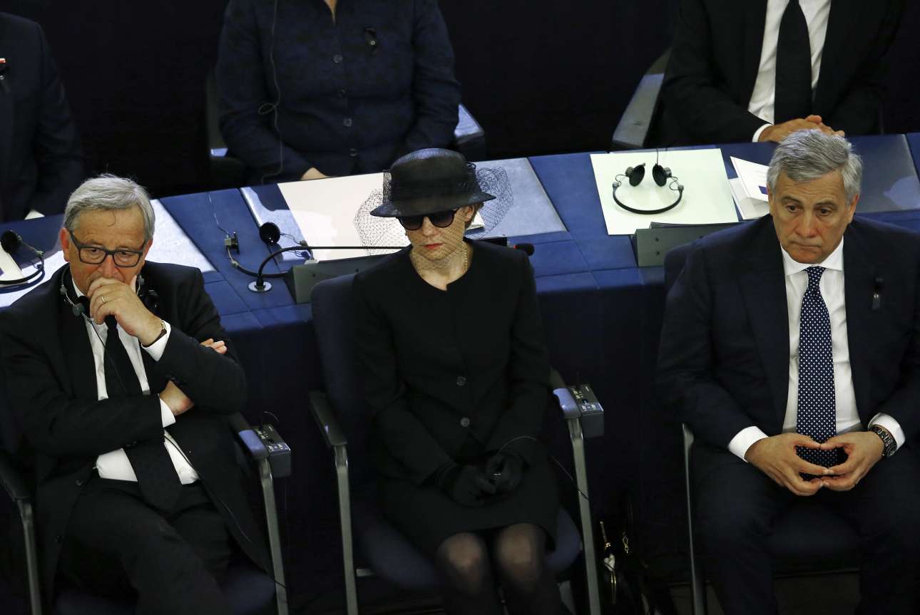 Ο πρόεδρος της Κομισιόν Ζαν-Κλοντ Γιούνκερ, η χήρα του Χέλμουτ Κολ, Μάικε Κολ-Ρίχτερ, και ο πρόεδρος του Ευρωπαϊκού Κοινοβουλίου Αντόνιο Ταγιάνι