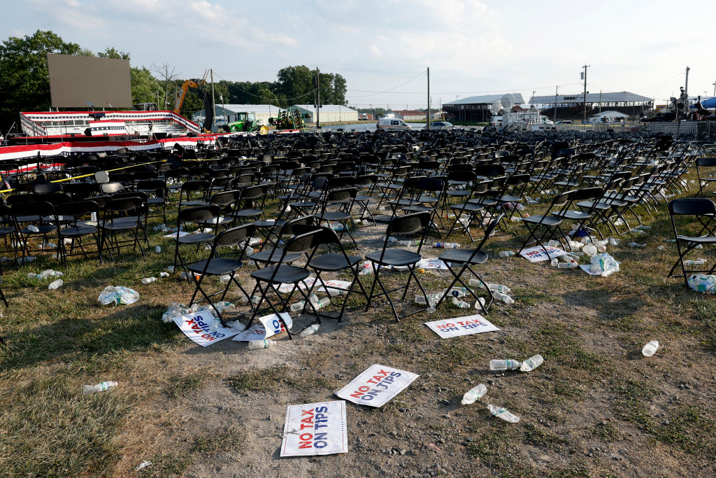 Αδεια πλαστικά μπουκάλια και πλακάτ με συνθήματα κάνουν παρέα στις άδειες πια καρέκλες στο «Butler Farm Show»