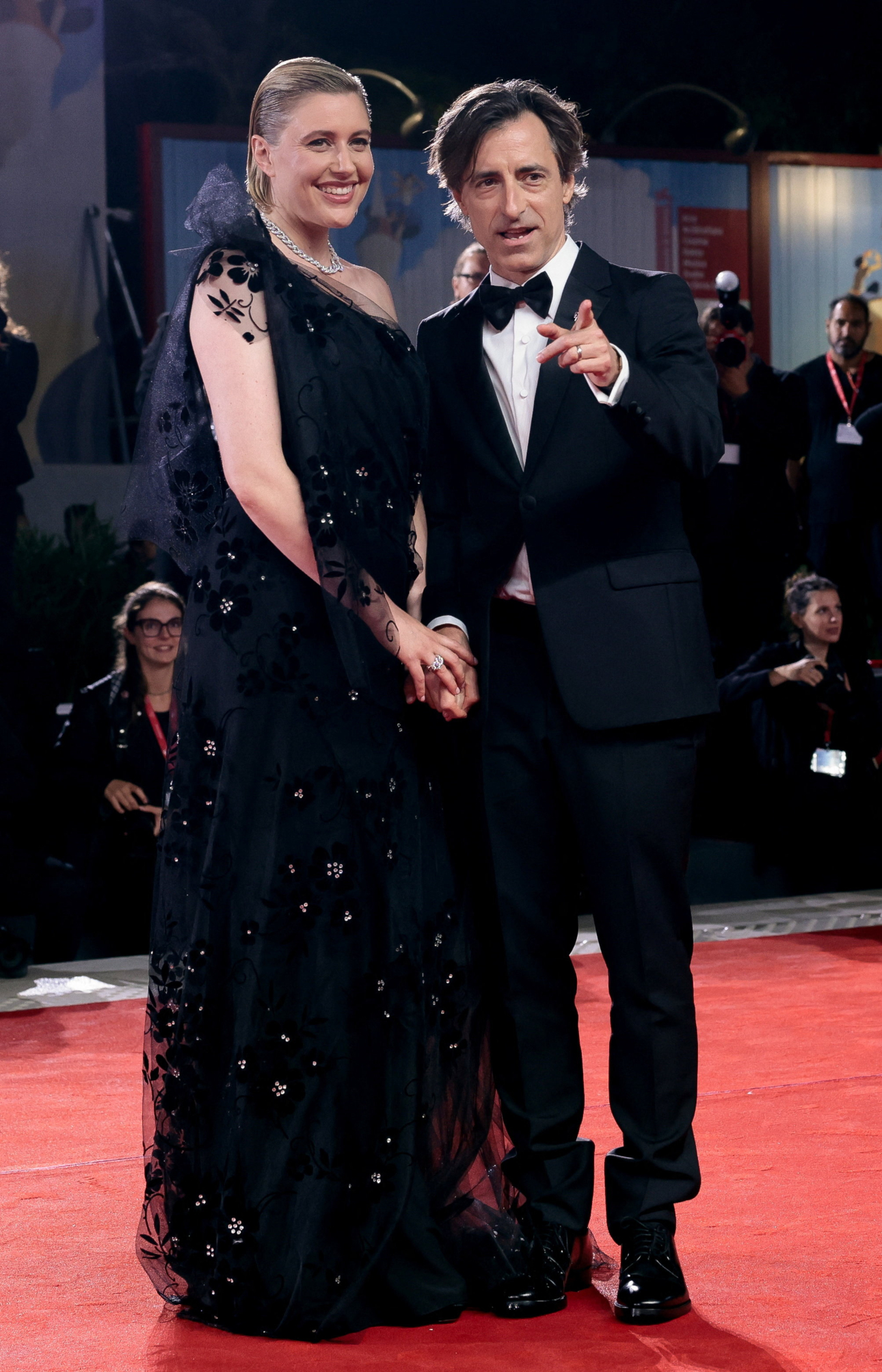 Ο σκηνοθέτης του «Jay Kelly», Νόα Μπάουμπαχ ποζάρει στο κόκκινο χαλί με την πρωταγωνίστρια της ταινίας Γκρέτα Γκέργουιγκ
