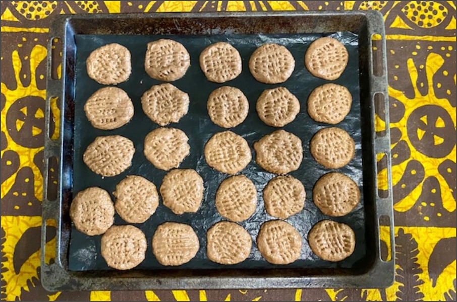 Φτιάχνετε μπαλάκια και πιέζετε λίγο την επιφάνειά τους «τσιμπώντας» τα με ένα πιρούνι ή τα κόβετε με κουπ-πατ. Αραδιάζετε τα μπισκότα σε μια λαμαρίνα σκεπασμένη με λαδόχαρτο ή αντικολλητικό φύλλο σιλικόνης και ψήνετε σε προθερμασμένο φούρνο στους 175 βαθμούς Κελσίου για περίπου 20 λεπτά.