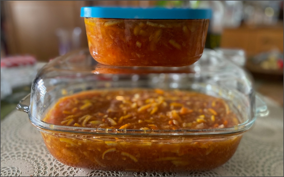 Εδώ στο χωριό οι πλαγιές είναι «βαμμένες» πράσινες με κίτρινες κηλίδες από τα λεμόνια, ανάμεσά τους φυτρώνουν και μερικές πορτοκαλιές. Το πεσκέσι που έρχεται κάθε χρόνο είναι τα πιο γλυκά (και τεράστια) μέρλιν πορτοκάλια που μπορείς να φανταστείς. Φτιάχνω κέικ με ολόκληρο πορτοκάλι, που γίνεται εκπληκτικό και όλοι το λατρεύουν, φυλάω πούλπα (ολόκληρα πορτοκάλια λιωμένα στο μούλτι) στην κατάψυξη μοιρασμένη σε σακουλάκια των 300 γρ για επόμενα κέικ, φτιάχνω μαρμελάδα. Σκέτη ή και με λεμόνι. Τα δικά μου πορτοκάλια είναι τόσο γλυκά που δεν χρειάζονται ούτε ξύσιμο της φλούδας ή βράσιμο για να φύγει η πίκρα. Απλά δεν έχουν πίκρα.