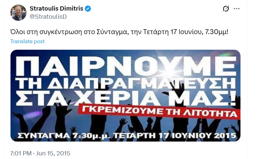 Η ανάρτηση-κάλεσμα του αναπληρωτή υπουργού Εργασίας του ΣΥΡΙΖΑ, Δημήτρη Στρατούλη, για τις 17/6/2015 στο Σύνταγμα και το μπάνερ τού «Μένουμε Ευρώπη» για συγκέντρωση την ίδια ώρα στο ίδιο μέρος την επομένη: