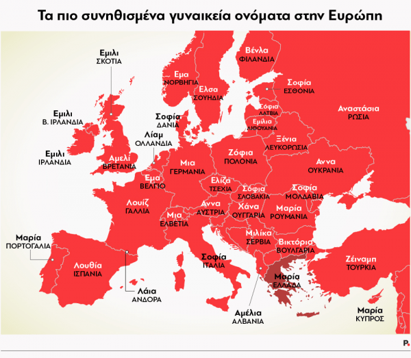 Ξέρουμε την Ευρώπη με όρους οικονομίας ή, ακόμη χειρότερα, με ποσοστά ανεργίας. Αμέσως το μάτι τραβάει μία οριζόντια γραμμή και τη χωρίζει στα δύο. Υπάρχουν βέβαια και οι γεωγραφικοί χάρτες, οι δημογραφικοί, οι πολιτικοί και οι ιστορικοί. Τελευταία διαμορφώνεται και μία Ευρώπη με βάση τον αριθμό προσφύγων που δέχεται η κάθε χώρα (αναγκαστικά ή οικειοθελώς) ή με βάση τον αριθμό συνοριοφυλάκων που τοποθετεί στα σύνορά της. Να και ένας κόκκινος χάρτης της Ευρώπης πιο παιχνιδιάρικος. Ποια ονόματα αγαπούν οι κάτοικοι της Γηραιάς Ηπείρου;