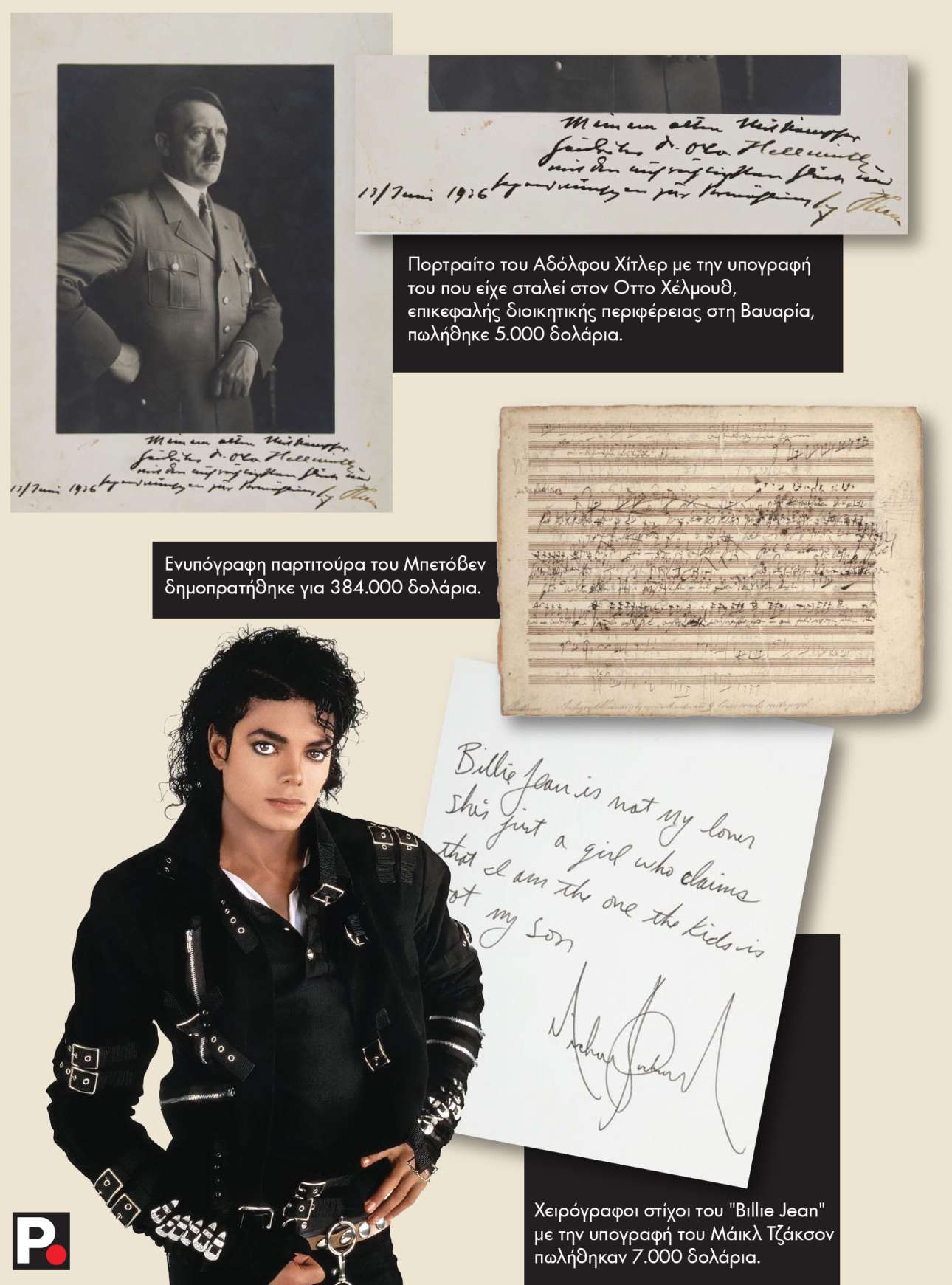 Ενα αυτόγραφο του Χίτλερ εκτιμάται στα 3.000 δολάρια, ενώ του Μουσολίνι στα 500. Μια φωτογραφία των Beatles με τις υπογραφές των τεσσάρων Σκαθαριών αξίζει 4.000 δολάρια (2.000 των Rolling Stones), αλλά ο δίσκος του Τζον Λένον τον οποίο υπέγραψε ο βρετανός τραγουδοποιός για τον Μαρκ Τσάπμαν, τον δολοφόνο του, λίγες στιγμές πριν αφήσει την τελευταία του πνοή, πωλήθηκε έναντι 793.000 δολαρίων.