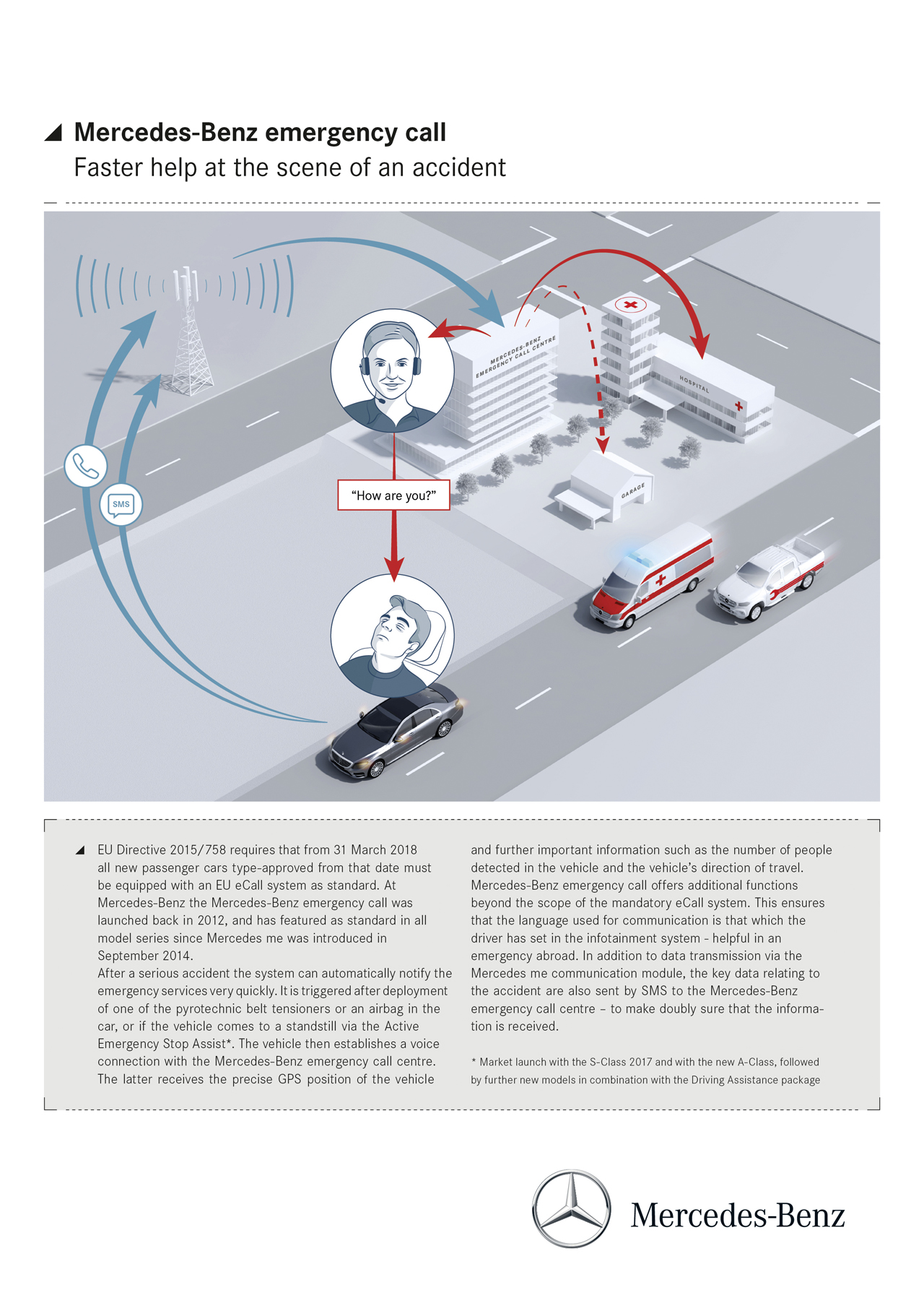 Εκπρόσωπος της φίρμας στη Μ. Βρετανία δήλωσε πως «η αναβάθμιση του συγκεκριμένου λογισμικού θα γίνει και σε άλλες χώρες» και ότι το ελαττωματικό eCall εντοπίστηκε από την ίδια τη Mercedes-Benz μέσω του προγράμματός της παρακολούθησης των συστημάτων ασφάλειας καθώς, ως γνωστόν, τέτοιου είδους ζητήματα είναι «κορυφαίας προτεραιότητας» για την εταιρεία.