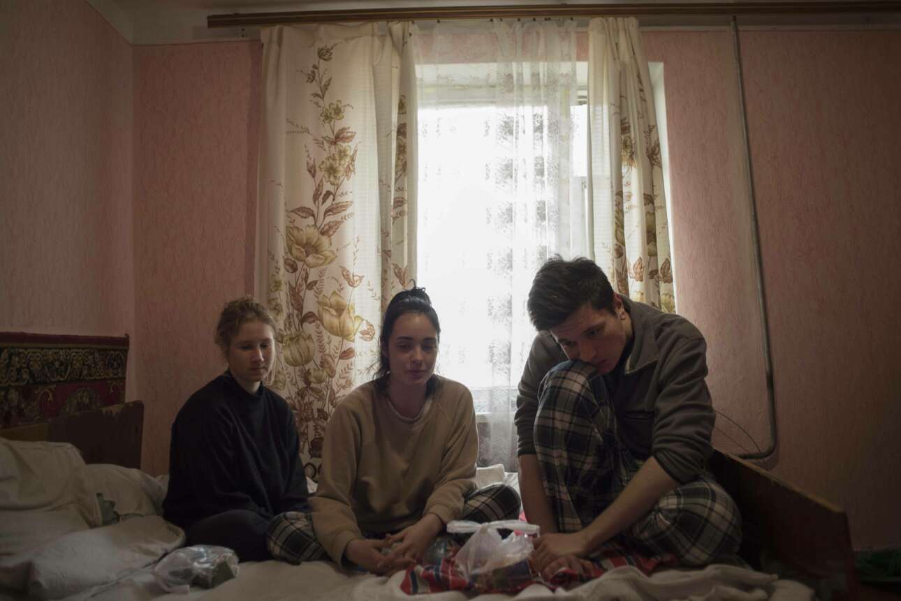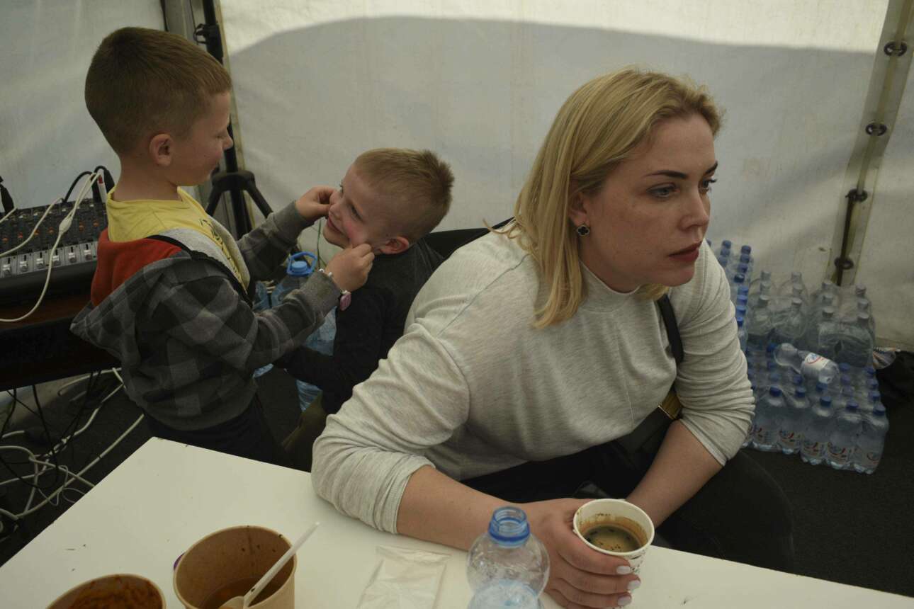 H Γιάννα Μπελόικομπα (φωτογραφία κάτω) με τους τρεις γιους της, ηλικίας, δύο, πέντε και έξι ετών, και με την πεθερά της, περιμένουν μέσα στη δομή εθελοντών από το Ισραήλ το βαν της πυροσβεστικής για να πάνε στο κοντινό αεροδρόμιο. Μόλις είχε εγκαινιάσει το δικό της ταξιδιωτικό γραφείο, στο Κίεβο. «Τώρα, πάμε στο Δουβλίνο επειδή μάθαμε ότι το κράτος βοηθά», λέει. Ο σύζυγός της έμεινε πίσω λόγω της επιστράτευσης.
