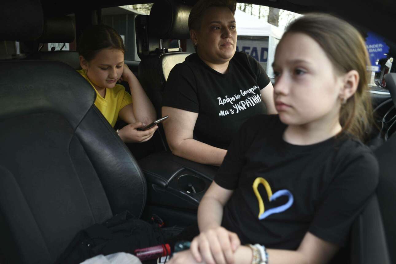 Η Βαλεντίνα Πασκάλ με τις κόρες της κλαίνε στην αγκαλιά του Κωνσταντίνου. Στις 4 Απριλίου άφησαν το σπιτικό τους, στη Μαριούπολη, στο έλεος της ρωσικής βίας.