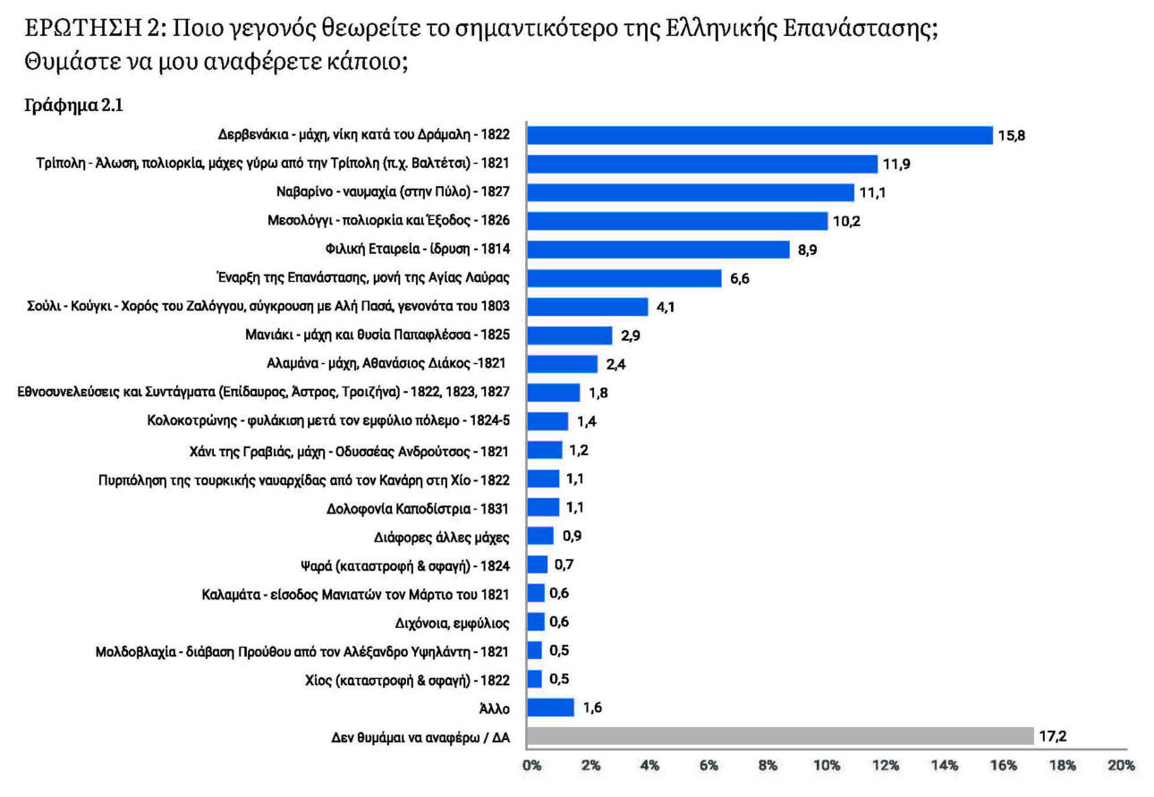 Η ερώτηση που αφορά τα σημαντικότερα γεγονότα του Αγώνα τέθηκε για πρώτη φορά στην παρούσα δημοσκόπηση, καλώντας τους συμμετέχοντες να αναφέρουν αυθόρμητα το σημαντικότερο κατά τη γνώμη τους γεγονός της Ελληνικής Επανάστασης.