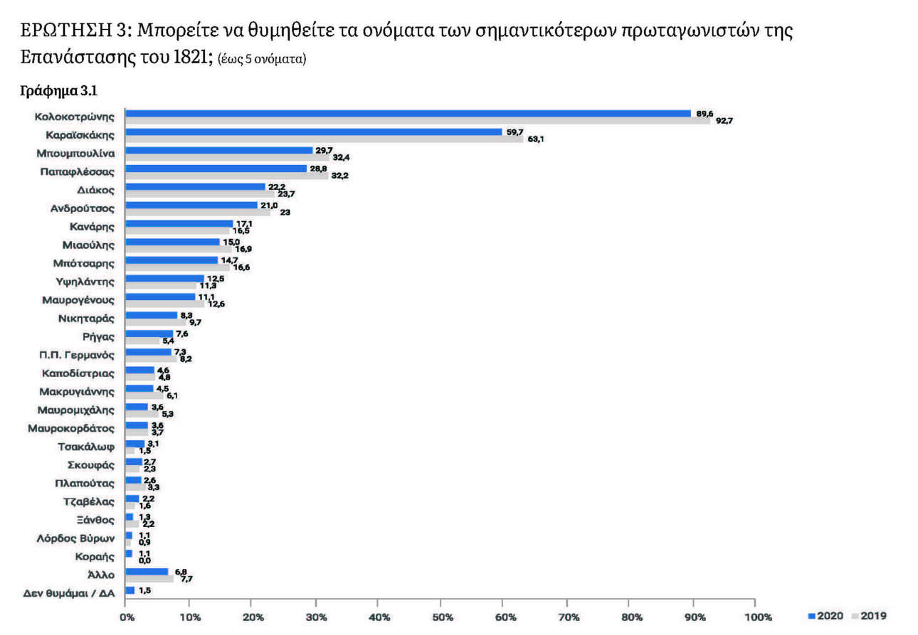Οι τρεις κυρίαρχες προσωπικότητες της Επανάστασης εξακολουθούν να είναι ο Θεόδωρος Κολοκοτρώνης (89,6%), ο Γεώργιος Καραϊσκάκης (59,7%) και η Μπουμπουλίνα (29,7%). Ο Αδαμάντιος Κοραής είναι το μοναδικό νέο πρόσωπο που προστέθηκε στον κατάλογο σε σχέση με την προηγούμενη δημοσκόπηση, εν μέρει κυρίως λόγω των νεότερων ερωτωμένων.