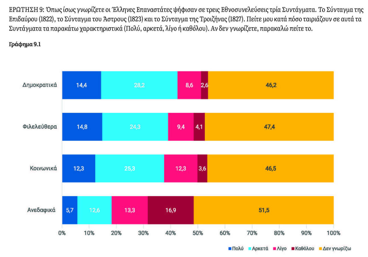 Η άγνοια για τις Εθνοσυνελεύσεις και τα Συντάγματα της εποχής είναι μεγάλη, ίσως όχι αδίκως αφού το θέμα είναι ειδικό: προσεγγίζει το 50%. Από εκείνους που απαντούν, η μεγάλη πλειονότητα αναδεικνύει τον δημοκρατικό και τον φιλελεύθερο χαρακτήρα των καταστατικών κειμένων.