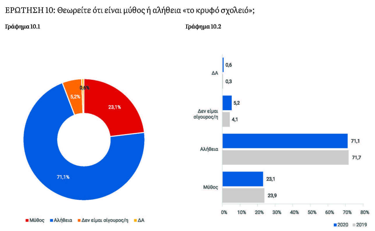 Ασφαλώς, μία από τις πλέον ενδιαφέρουσες θεματικές ενότητες της έρευνας είναι αυτή που επιγράφεται «Μύθοι ή Αλήθειες». Οι σχολιαστές μίλησαν χωρίς περιστροφές για την ανθεκτικότητα των μύθων, όχι ενός και δυο… Εμβληματικό, το δίχως άλλο, το Κρυφό Σχολειό με 71,1%.