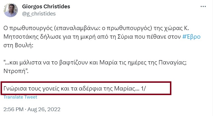 Στις 26 Αυγούστου ο Μητσοτάκης αναφέρεται στη Βουλή -στη συζήτηση για τις υποκλοπές- σε όσα πολύ βαριά ακούγονται για το ζήτημα του Εβρου: «Δεν γίνεται να υπάρχουν δυνάμεις σε αυτή την χώρα που να σιγοντάρουν με ψέματα και ότι η Ελλάδα άφησε ένα μωρό να πεθάνει και το βάφτισαν και Μαρία την ημέρα της Παναγίας. Ντροπή να λέγονται τέτοια πράγματα».