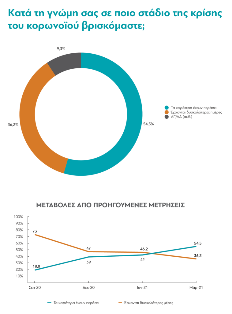 Παρ’ όλα αυτά, πλέον για πρώτη φορά οι περισσότεροι Ελληνες θεωρούν ότι «τα χειρότερα έχουν περάσει». Στην ερώτηση για το στάδιο της κρίσης στο οποίο, κατά τη γνώμη τους βρισκόμαστε, από τον Σεπτέμβριο του 2020 και μέχρι τον περασμένο Ιανουάριο, οι περισσότεροι απαντούσαν ότι «τα χειρότερα είναι μπροστά μας». Η επιτυχημένη έναρξη των εμβολιασμών φαίνεται πως άλλαξε αυτή την εικόνα. Πλέον μια (όχι πολύ μεγάλη, αλλά σαφής) πλειοψηφία, το 54,5%, λένε ότι τα χειρότερα είναι πίσω μας.