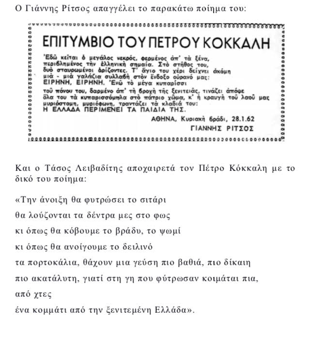 Πολλές οι παρακαταθήκες του Πέτρου Κόκκαλη. Και μία από τις πιο καίριες, για τις μέρες που ζούμε, μία γραφή του από τα χρόνια του Εμφυλίου όπου ανέφερε ότι αν νικούσαν εκείνοι, το μέγα χρέος τους θα ήταν να κάνουν και τους ηττημένους να νοιώσουν νικητές.