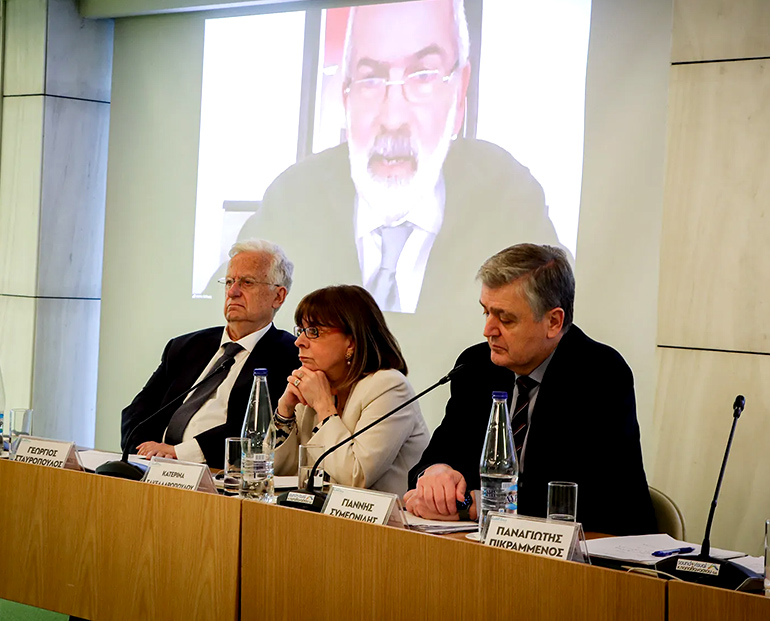 Ακολούθησε στρογγυλή τράπεζα, στην οποία τα θέματα που παρουσιάστηκαν συζήτησαν με τους εισηγητές οι: Κατερίνα Σακελλαροπούλου, τ. Πρόεδρος της Δημοκρατίας, Παναγιώτης Πικραμμένος, Πρόεδρος του Συμβουλίου της Επικρατείας ε.τ., πρώην Πρωθυπουργός, τ. Αντιπρόεδρος της Κυβέρνησης (2019-2023), Ιωάννης Σαρμάς, τ. Υπηρεσιακός Πρωθυπουργός, Επίτιμος Πρόεδρος του Ελεγκτικού Συνεδρίου, Γεώργιος Σταυρόπουλος, Πρόεδρος της Κεντρικής Επιτροπής Κωδικοποίησης, Επίτιμος Αντιπρόεδρος του Συμβουλίου της Επικρατείας, πρώην Υπουργός Επικρατείας (2011-2012), και Γιάννης Ρέτσος, Πρόεδρος ΔΣ ΙΟΒΕ, Αντιπρόεδρος & CEO Electra Hotels & Resorts. Η εκδήλωση ολοκληρώθηκε με ανοιχτή συζήτηση του κοινού με τους συμμετέχοντες.
