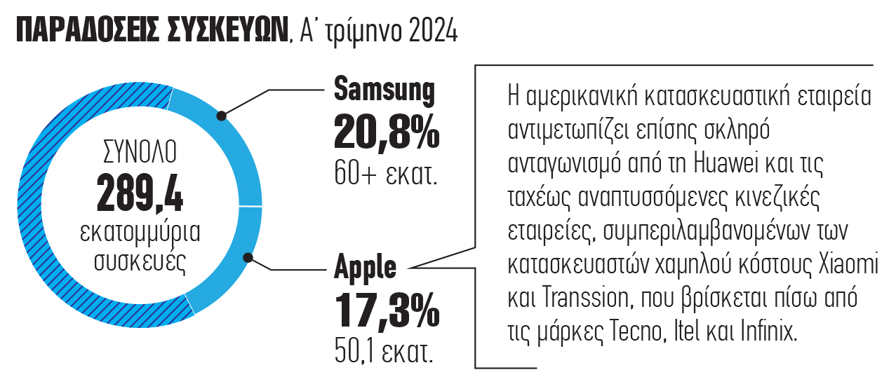 Η βασίλισσα απήλθε, ζήτω η νέα βασίλισσα! Η Apple έχασε τη θέση της στην κορυφή των εταιρειών που κατασκευάζουν κινητά τηλέφωνα, από τη Samsung, αφού οι πωλήσεις iPhones μειώθηκαν σχεδόν κατά 10% τους πρώτους τρεις μήνες του 2024.