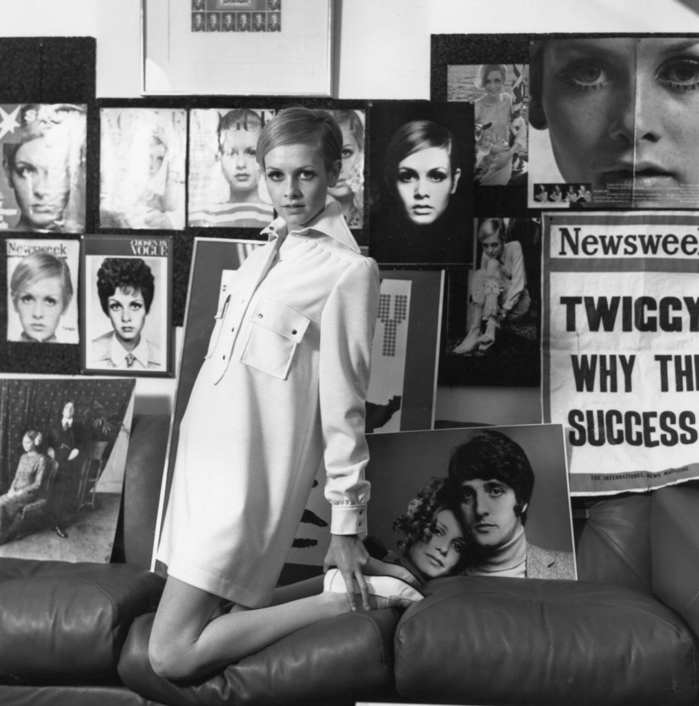 Η  Tουίγκι τη δεκαετία του 1960, μπροστά από τεκμήρια της διασημότητας της, αφίσες και εξώφυλλα περιοδικών (M McKeown/Getty Images)