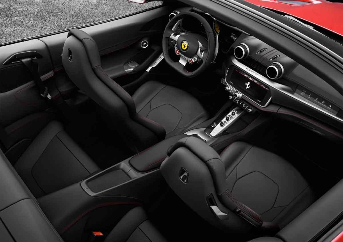 Αντίστοιχα, το κόκπιτ τής Portofino είναι περισσότερο ποιοτικό από εκείνο της California T, ενώ με την 812 Superfast «φοράνε» το ίδιο τιμόνι. Από την επίσης ομόσταυλη GTC4Lusso προήλθε η μεγάλη οθόνη αφής του συστήματος πολυμέσων, 10,2 ιντσών – «εικόνισμα» για μετάνοιες στο κέντρο του ταμπλό.