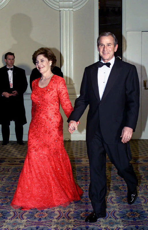 Η σύζυγος του 43ου προέδρου των ΗΠΑ διάλεξε ένα φόρεμα που τιμούσε το Τέξας, το τόπο καταγωγής της, αλλά και το χρώμα του κόμματός της. Ηταν μια δημιουργία με μακριά μανίκια του Μάικλ Φέαρκλοθ, designer με έδρα το Ντάλας, από μετάξι και δαντέλα στην απόχρωση του «Ρεπουμπλικανικού κόκκινου», κεντημένη με κρύσταλλα. Το ασορτί clutch bag ήταν της Τζούντιθ Λάιμπερ, που είχε φτιάξει πριν από τη δική της και τις βραδινές τσάντες των Μάμι Αϊζενχάουερ, Χίλαρι Κλίντον, Μπάρμπαρα Μπους και Νάνσι Ρίγκαν.
