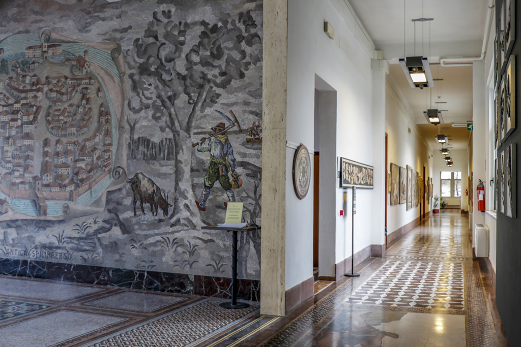 Στους διαδρόμους της σχολής, ψηφιδωτά αντίγραφα έργων τέχνης, όπως η «Πιετά» του Μιχαήλ Αγγέλου και η «Παναγία με το Βρέφος» από την Αγία Σοφία της Κωνσταντινούπολης, κοσμούν τους τοίχους. Ψηφιδωτά σκαρφαλώνουν και σε επίπεδες επιφάνειες και κουλουριάζονταν γύρω από γωνίες, μετατρέποντας ολόκληρο το κτίριο σε ένα ζωντανό αρχείο μοτίβων, ακρίβειας και υπομονής.