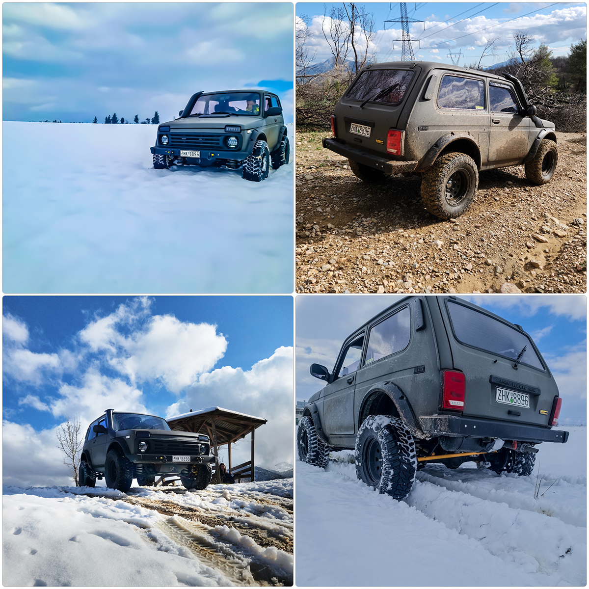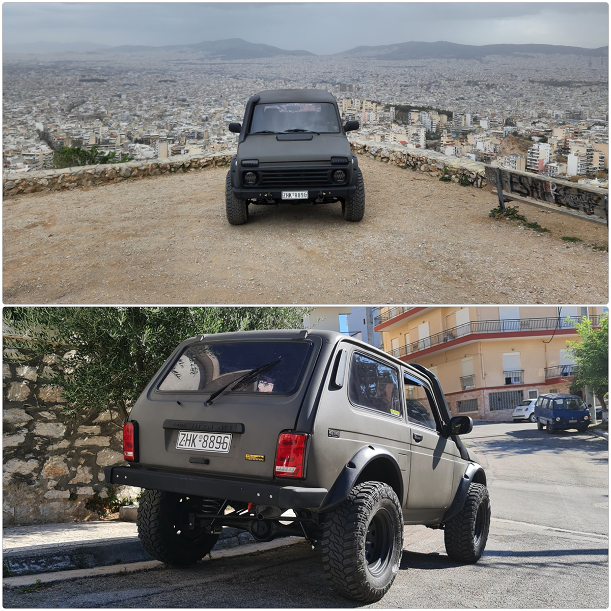 Βάφτηκε σε αυτό το ιδιαίτερο γκρι που βλέπετε. Οπως εξηγεί, «είναι ειδική βαφή, ελληνικής μάλιστα εταιρείας, που το κάνει σαγρέ. Ακριβώς για να μη γδέρνεται η λαμαρίνα όταν περνάς από κλαδιά στα βουνά. Σε περίπτωση που ενδιαφέρει, είναι της HB Body, ο κωδικός του χρώματος είναι ο 955 Tough Liner, ενώ τα φουσκώματα είναι της F-Design, που βγάζει βελτιωτικά προϊόντα για Niva». Εννοείται ότι έκοψε θόλους για να χωρέσουν οι μεγάλοι τροχοί, τοποθετήθηκε σκληροπυρηνική ανάρτηση που αναβαθμίζει ακόμα περισσότερο τις εκτός δρόμου δυνατότητές, και τελικά έγινε κάστομ κατάσταση – φαίνεται και στις φωτογραφίες.